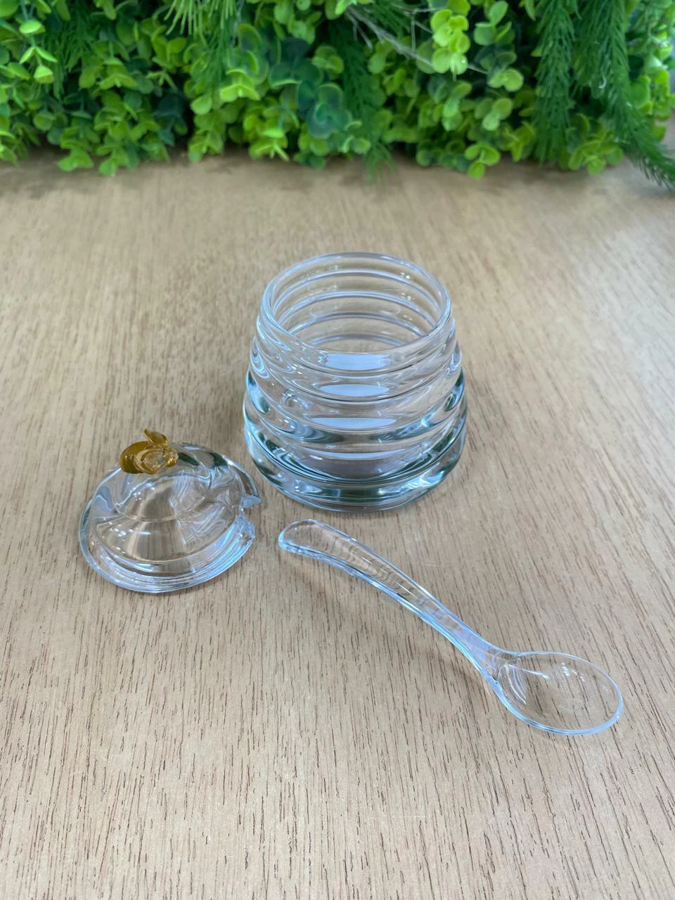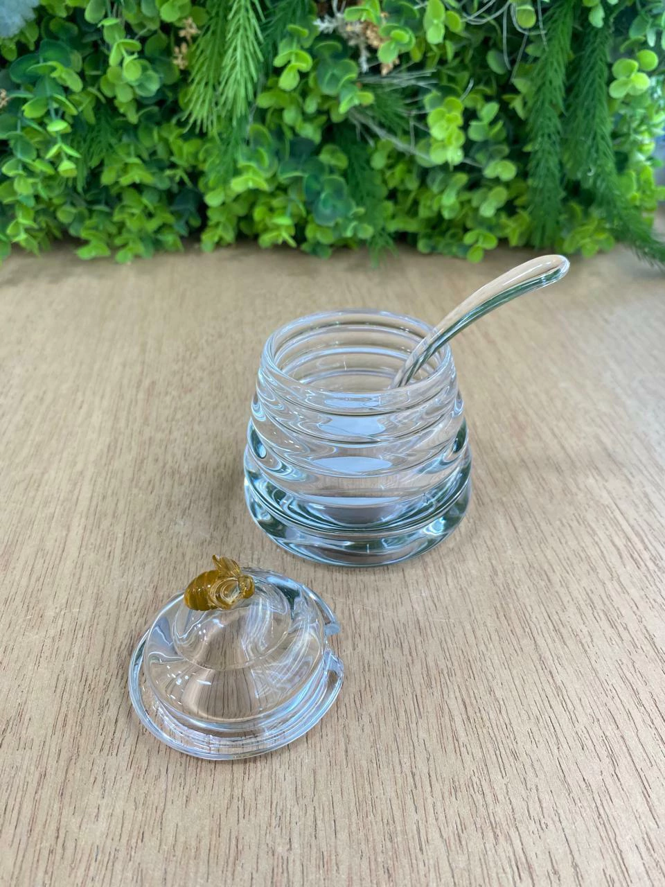 O pote tem um formato que lembra uma pequena colmeia, com ranhuras que criam uma textura suave e sofisticada. A tampa, que se encaixa perfeitamente, é coroada por uma delicada abelhinha em vidro, que adiciona um toque sutil de charme e personalidade à peça.