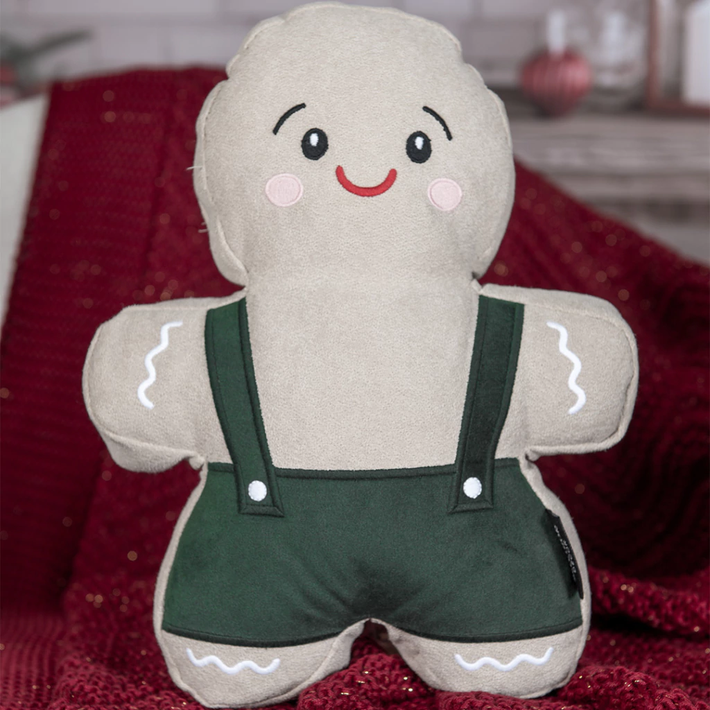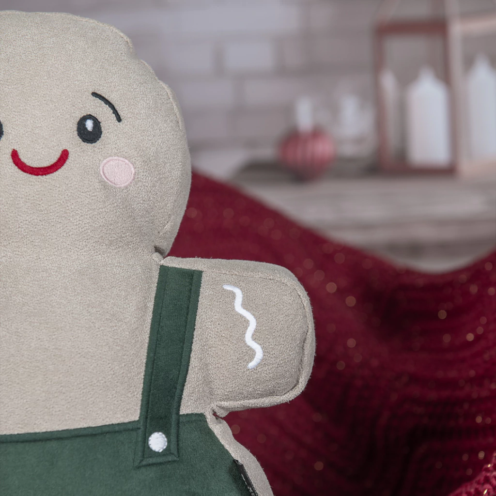 A peça tem o formato de um biscoito de gengibre menino com um design charmoso e lúdico. Feita com um tecido macio, a almofada apresenta uma calça de veludo na cor verde com suspensórios. Os detalhes de "glacê" nas pernas e braços são bordados, adicionando um toque de charme e fazendo dela ideal para decorar a sala de estar ou quartos, ou até mesmo para presentear alguém querido durante as festas de fim de ano.