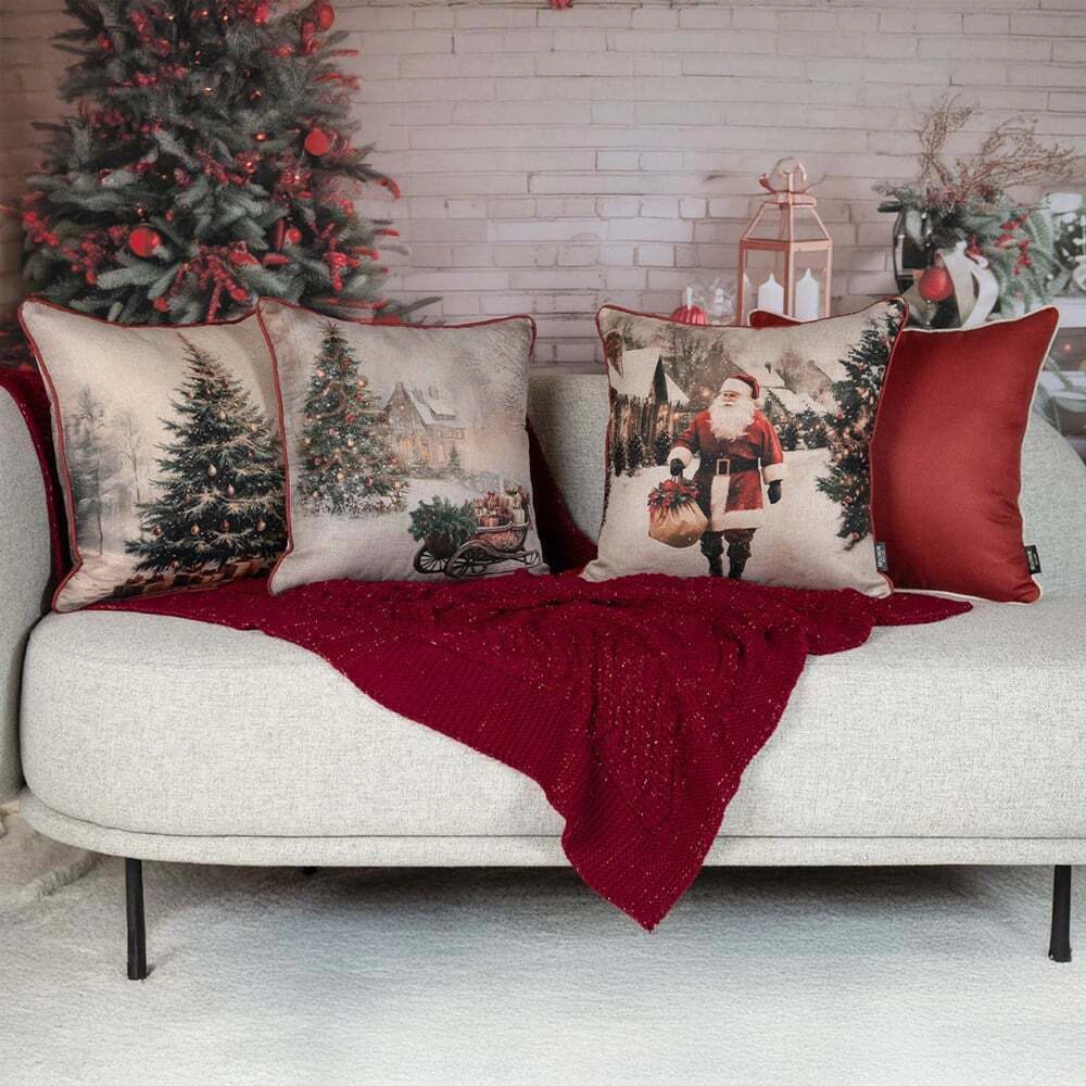 Estampa Impactante: A almofada apresenta uma imagem que simula uma pintura ou fotografia vintage, retratando o Papai Noel em seu traje tradicional vermelho e branco. Ele caminha por uma rua coberta de neve, cercado por casas iluminadas e pinheiros festivos.