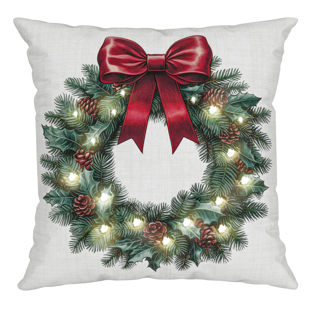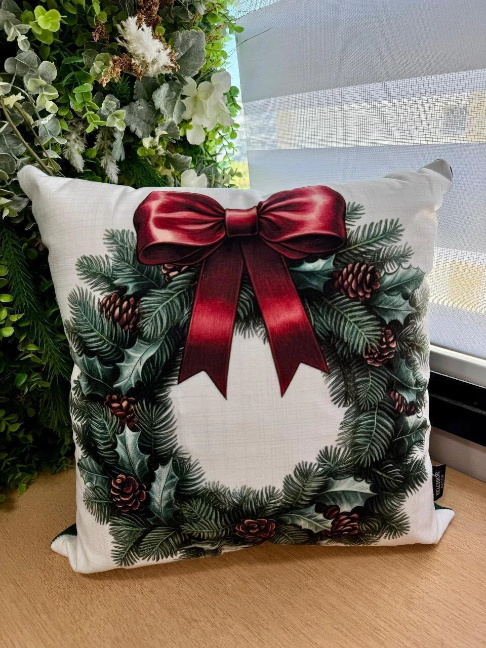 Esta é uma almofada decorativa de 43x43cm com estampa de guirlanda de Natal.