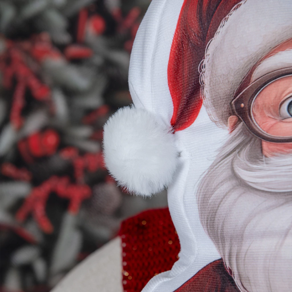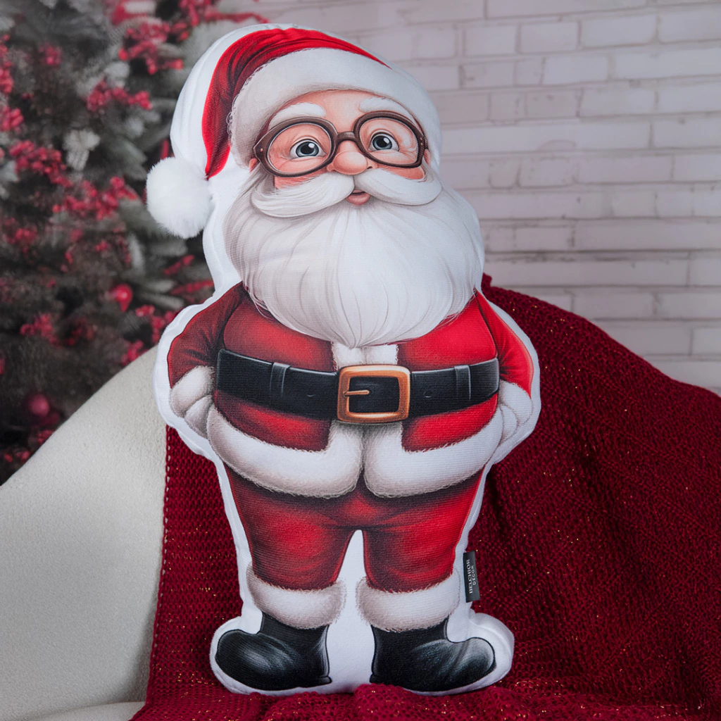 A almofada tem o formato de um Papai Noel, com um acabamento suave e uma estampa de alta qualidade. Com design de dupla face, ela apresenta de um lado o rosto amigável do bom velhinho com seus óculos redondos e barba branca, e do outro, o Papai Noel de costas com um saco cheio de presentes.