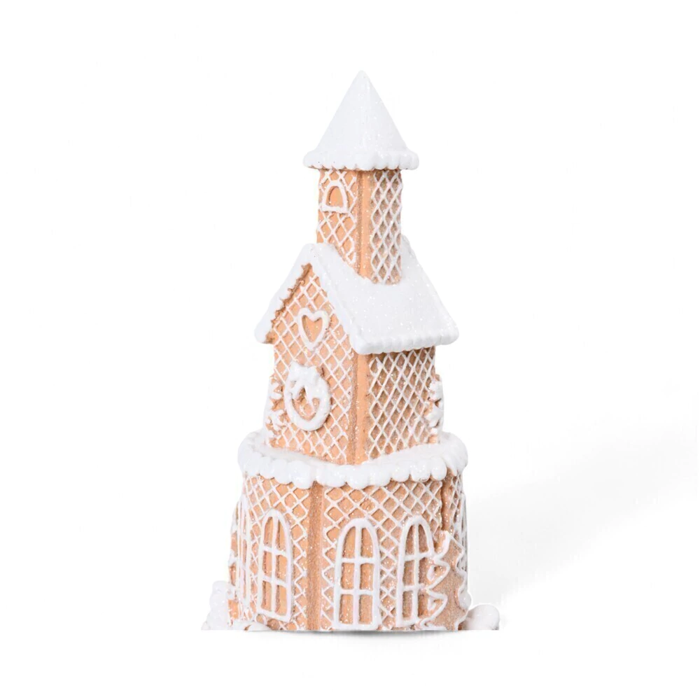 Com 40,5 cm de altura, este castelo de múltiplos níveis apresenta uma estrutura cônica ricamente texturizada na cor caramelo, perfeitamente adornada com intrincados desenhos em "glacê" branco. Os detalhes de janelas xadrez, padrões de treliça e flocos de neve em relevo parecem ter sido feitos com glacê de verdade, criando uma ilusão irresistível de uma guloseima natalina.