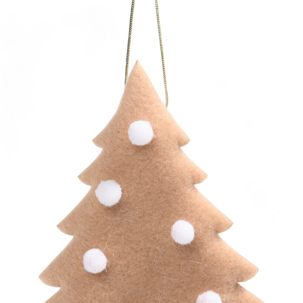 Com 11cm de altura, ela é feita de um material macio e aveludado na cor marrom e é decorada com pequenos pompons brancos que parecem flocos de neve. O enfeite vem com um cordão dourado para ser pendurado facilmente, adicionando um toque rústico e aconchegante à sua decoração