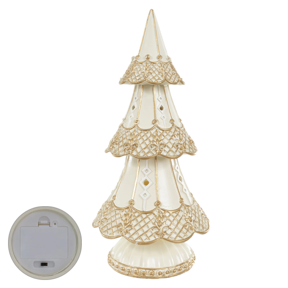 Textura e Detalhes: Cada camada da árvore é ricamente decorada com um padrão intrincado que lembra uma renda ou treliça real, ressaltado pelo dourado. A superfície branca possui pequenas perfurações que servem para dispersar a luz interna. A base é mais larga e ornamentada com pequenas esferas douradas.