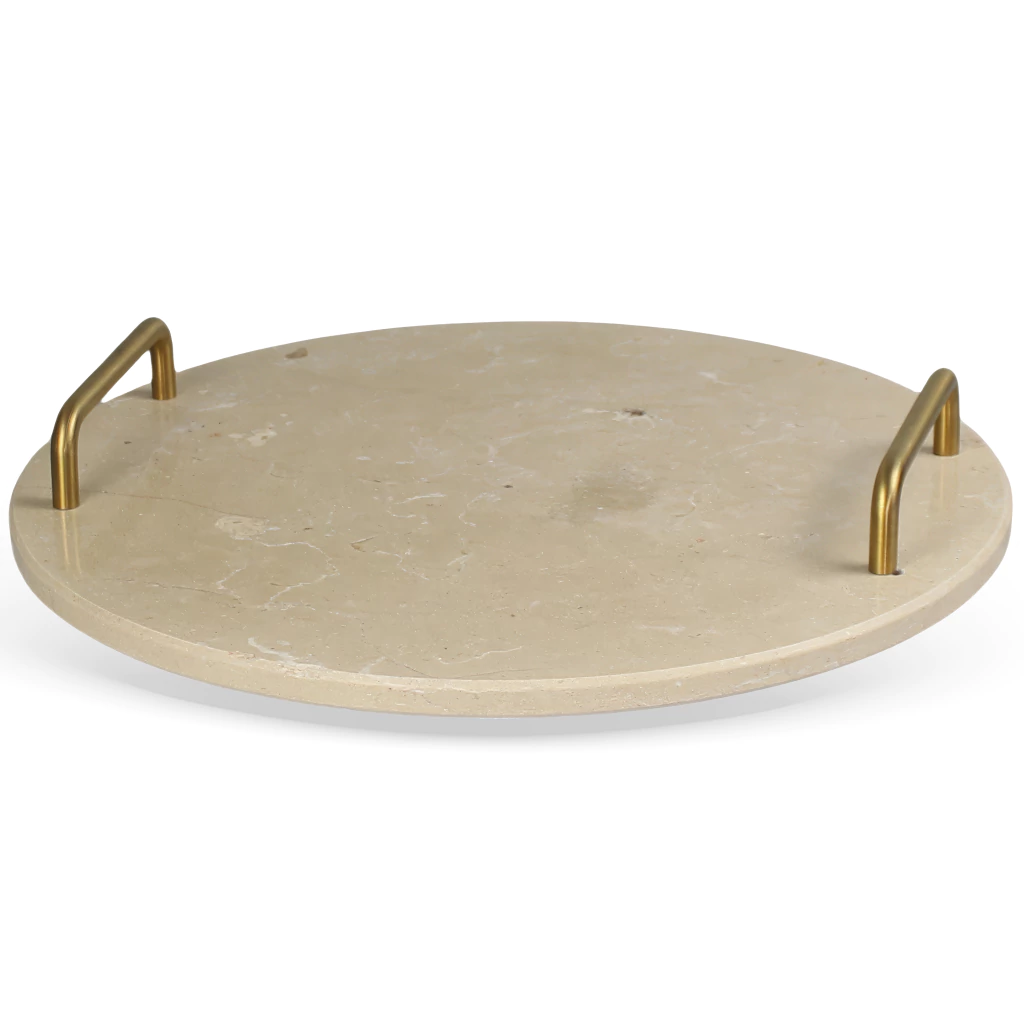 A Bandeja Redonda em Pedra Natural com Alças Douradas é uma peça statement que une funcionalidade, sofisticação e a beleza orgânica da natureza.