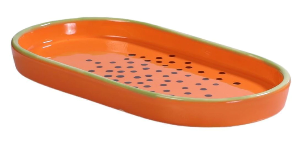 Design Fiel e Tropical: A bandeja tem um formato oval e é revestida em um esmalte laranja intenso e brilhante, que reproduz a cor da polpa madura do mamão.