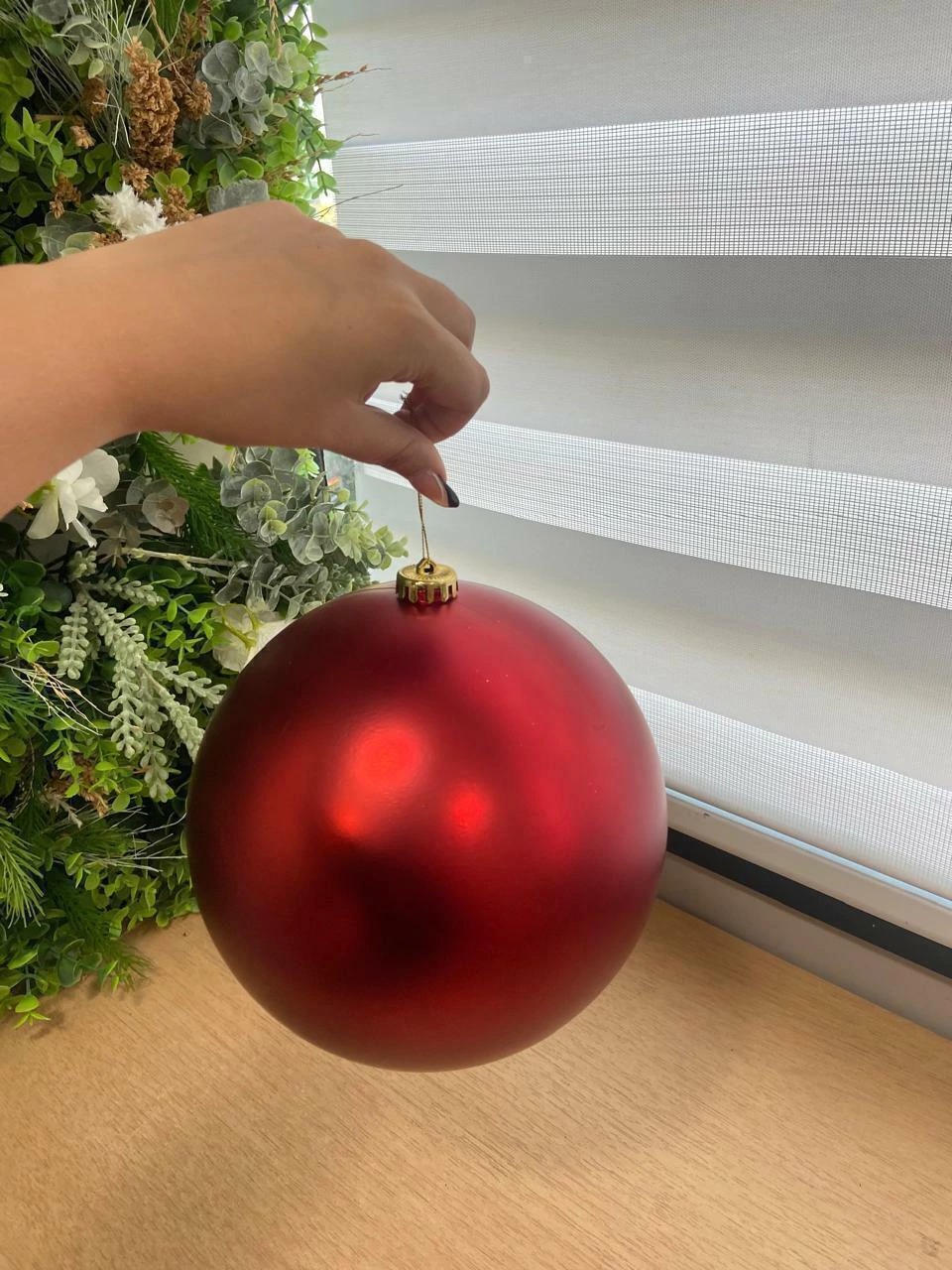O seu acabamento fosco e opaco em um vermelho profundo cria um visual elegante e moderno, contrastando com o brilho metálico do suporte dourado na parte superior. O tamanho grande da bola a torna um ponto focal na decoração, capaz de transformar qualquer ambiente com sua presença marcante e luxuosa.