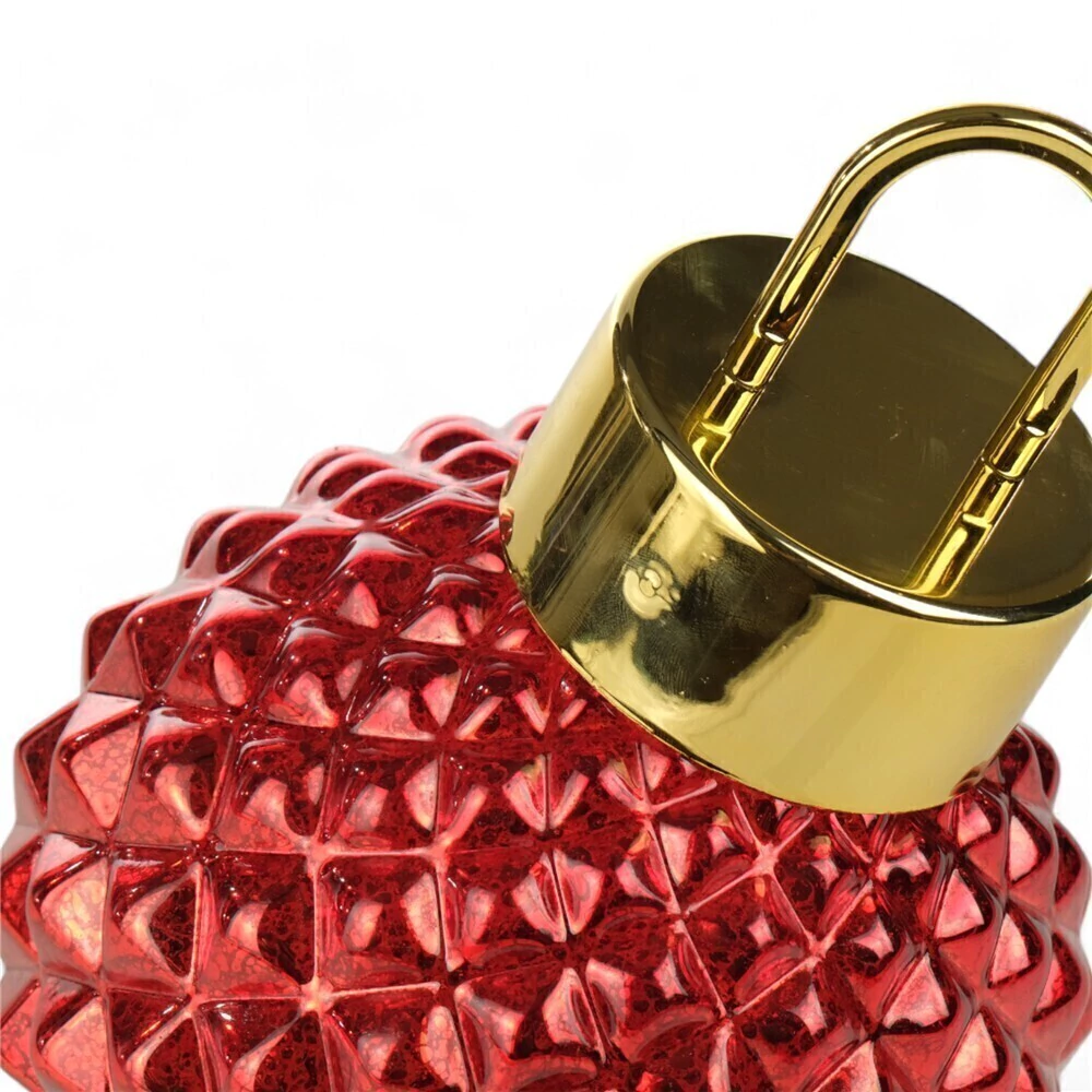 O principal diferencial é que a bola é iluminada internamente com LED, emitindo um brilho quente e acolhedor. O acabamento no topo é um gancho dourado que reforça o visual clássico de um ornamento de Natal.