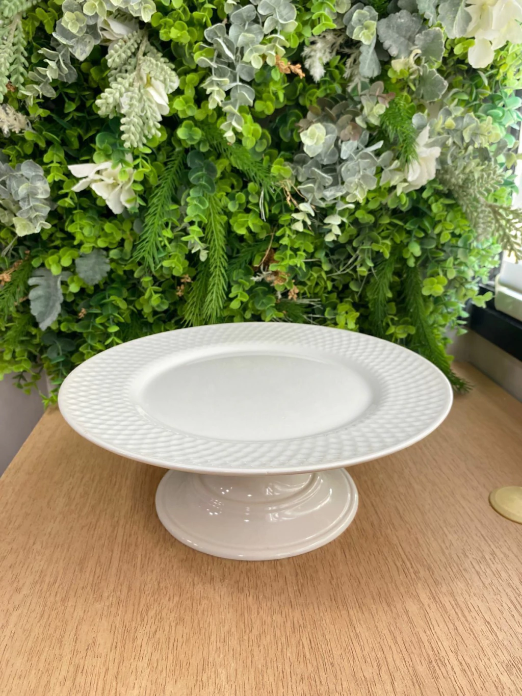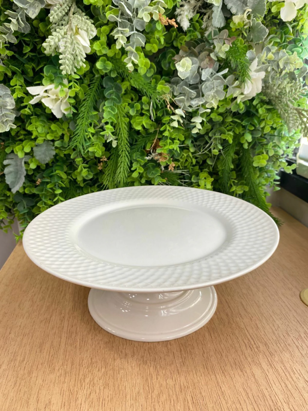 Boleira de tamanho médio, na cor branca, com um design elegante e funcional. A peça é composta por uma base redonda e uma superfície de apoio para bolo. Tanto a borda do prato superior quanto a borda da base possuem um padrão em alto-relevo de trama, formando pequenos losangos texturizados. O centro da peça é liso e brilhante, ideal para acomodar bolos e doces. A peça é perfeita para elevar a apresentação de sobremesas em mesas de festa, jantares e ocasiões especiais.
