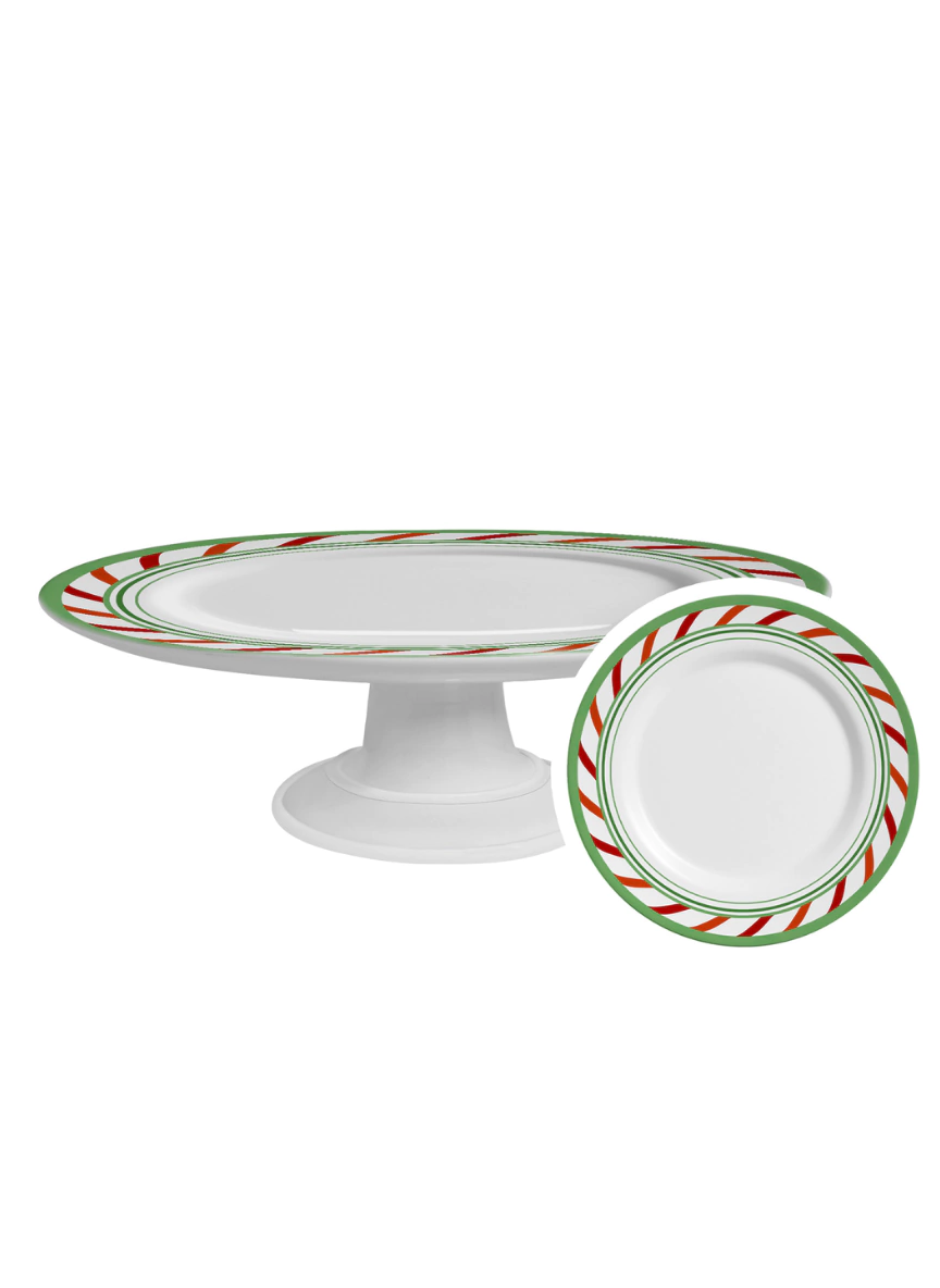 Com 29cm de diâmetro, ela é ideal para servir bolos, doces ou cupcakes de forma elegante e temática. A peça apresenta um acabamento que remete à roupa dos duendes do Papai Noel, com a borda verde-clara e listras vermelhas. É uma peça funcional e decorativa, que transforma qualquer sobremesa em um item de destaque na sua celebração.