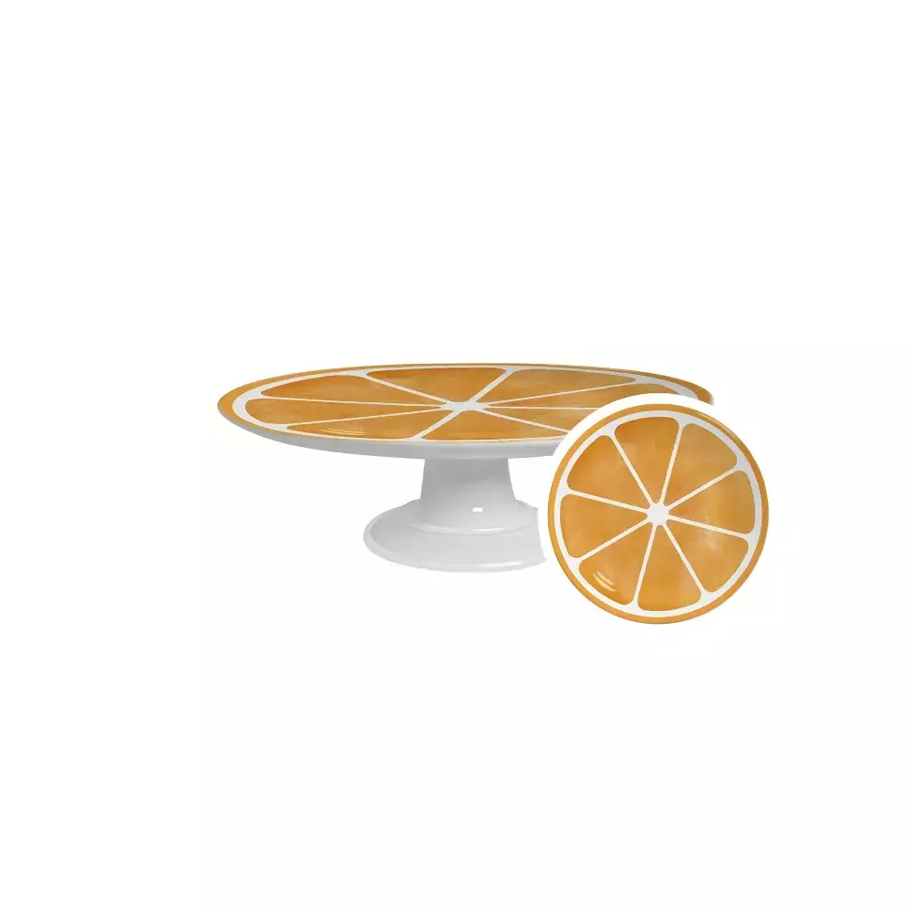 Com um design moderno, a boleira de cerâmica tem uma base branca e exibe, no tampo, a estampa de uma fatia de laranja suculenta, completa com as divisões brancas dos gomos. Ela é ideal para servir bolos, tortas e cupcakes em reuniões informais ou celebrações temáticas, adicionando uma dose de energia cítrica à sua decoração.