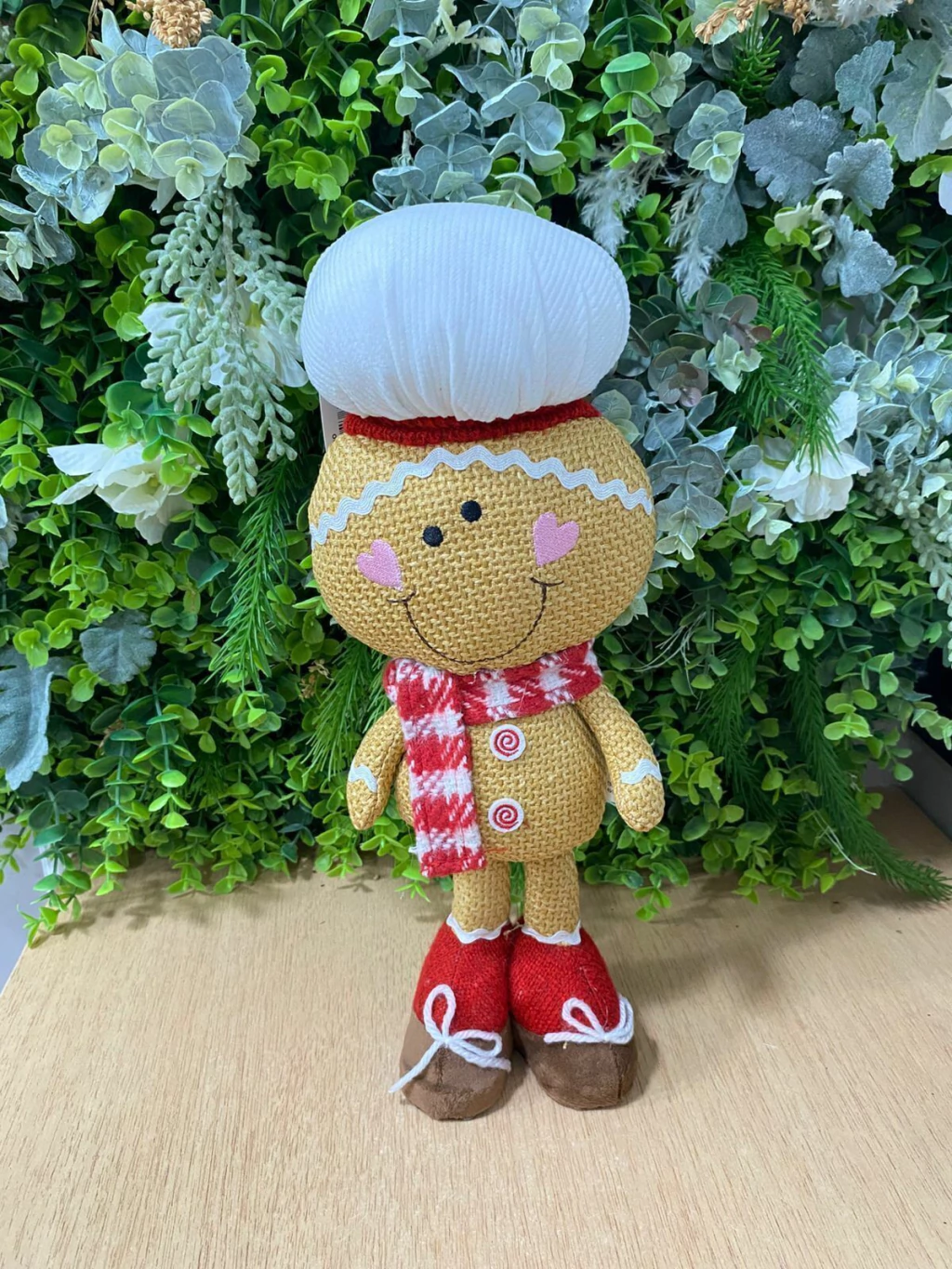 O boneco veste um gracioso chapéu de chef branco e um charmoso cachecol xadrez vermelho e branco, que dão um toque acolhedor e festivo. Nos pés, calça sapatinhos vermelhos com cadarços brancos, completando seu visual alegre e cheio de personalidade.