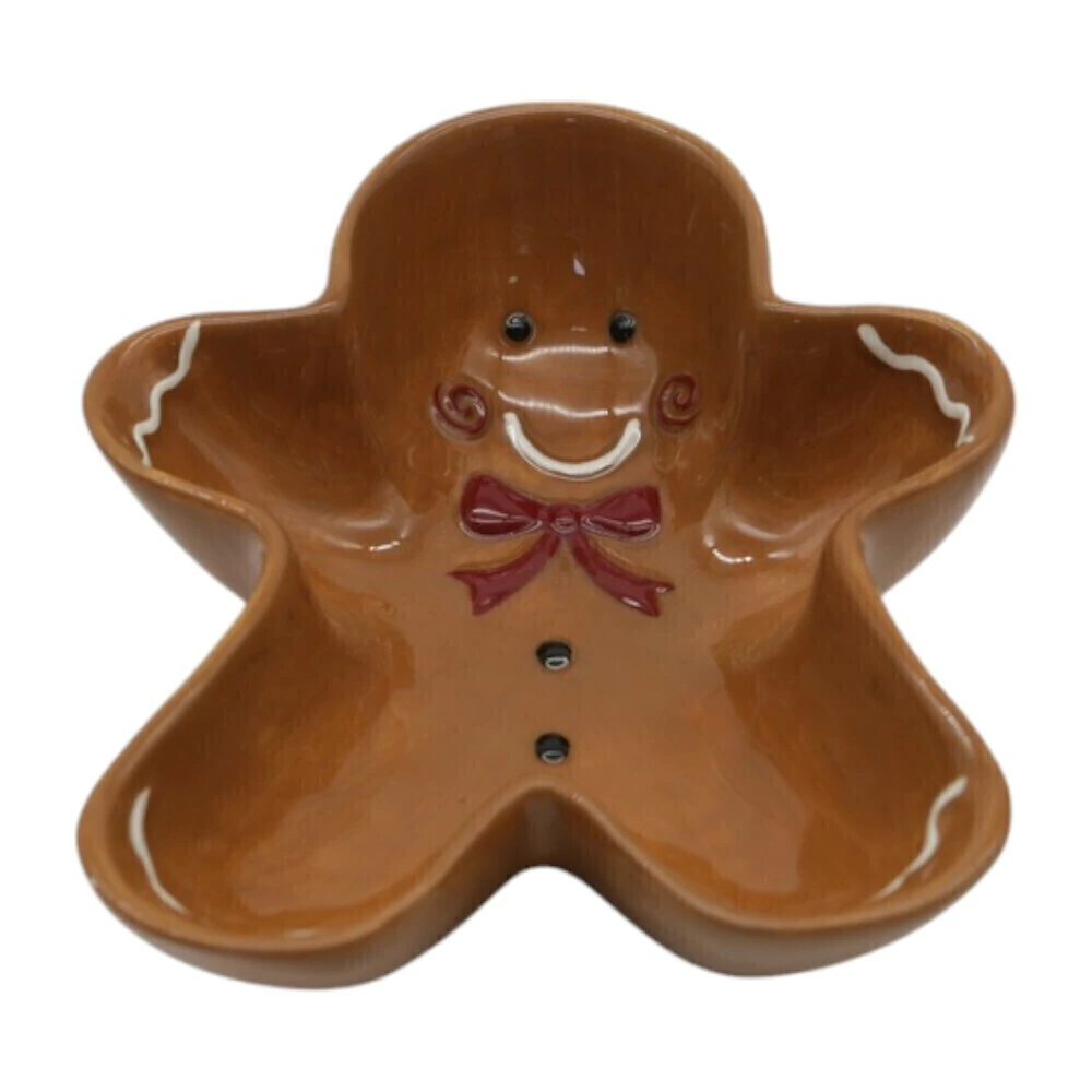 Feita em cerâmica de alta qualidade com um acabamento em marrom e detalhes esmaltados, ela tem o formato de um biscoito de gengibre com um sorriso gentil e um laço vermelho. É a peça ideal para dar um toque lúdico e natalino à sua mesa.