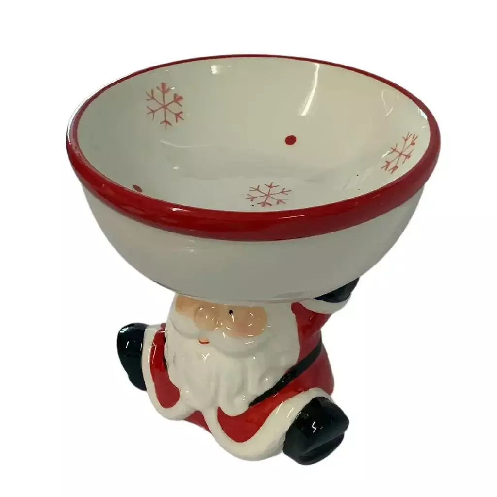Bowl (Tigela): A parte superior é um bowl fundo, ideal para servir. É de cor branca por dentro (e aparentemente por fora) e possui um acabamento de borda em vermelho vibrante, que complementa o traje do Papai Noel.
