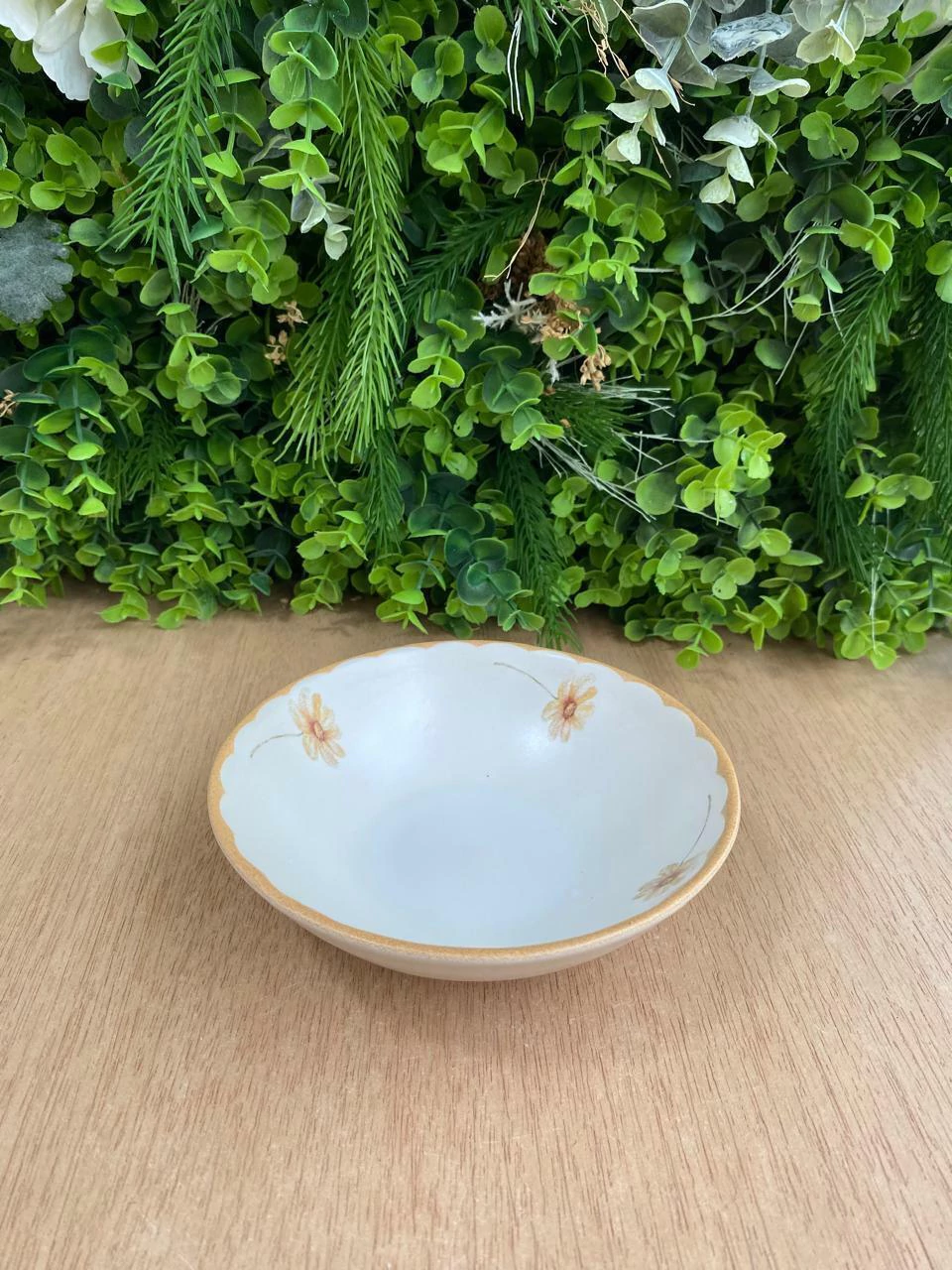 Este é um bowl da linha Rústica Campestre, com um design delicado e um formato que evoca a beleza natural. O bowl é feito de cerâmica branca, com a borda em um acabamento em tom bege ou caramelo, e as bordas internas são decoradas com pequenas flores amarelas, conferindo um ar campestre e acolhedor, ideal para servir porções individuais, sopas, saladas ou sobremesas.