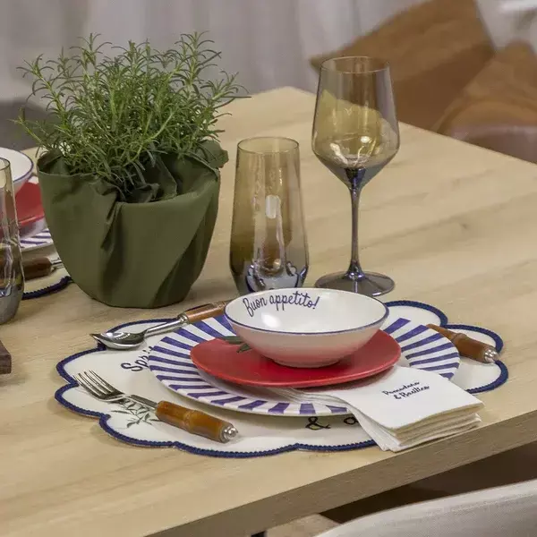 Mensagem Acolhedora: O interior do bowl destaca-se pela escrita "Buon appetito!" (Bom apetite!) em uma charmosa caligrafia na cor azul-cobalto ou marinho, convidando os seus convidados a desfrutarem da refeição.