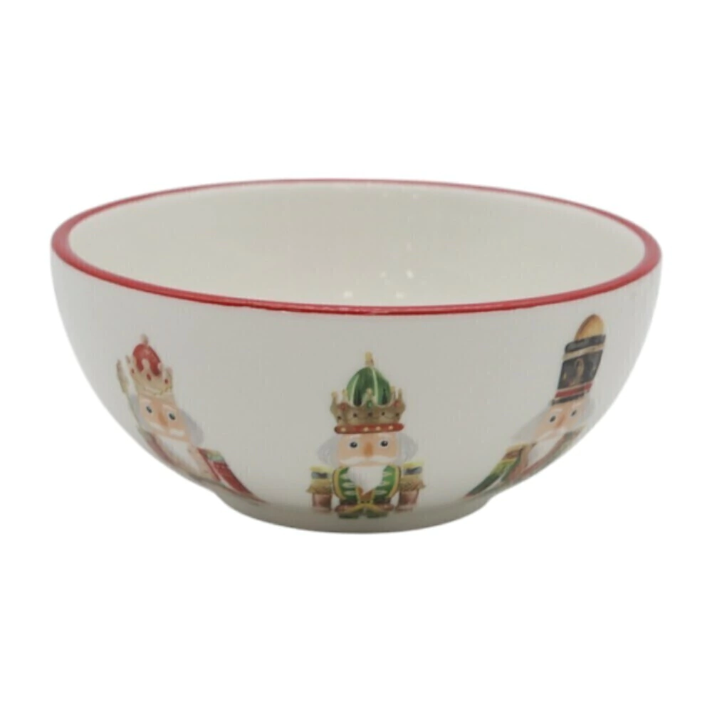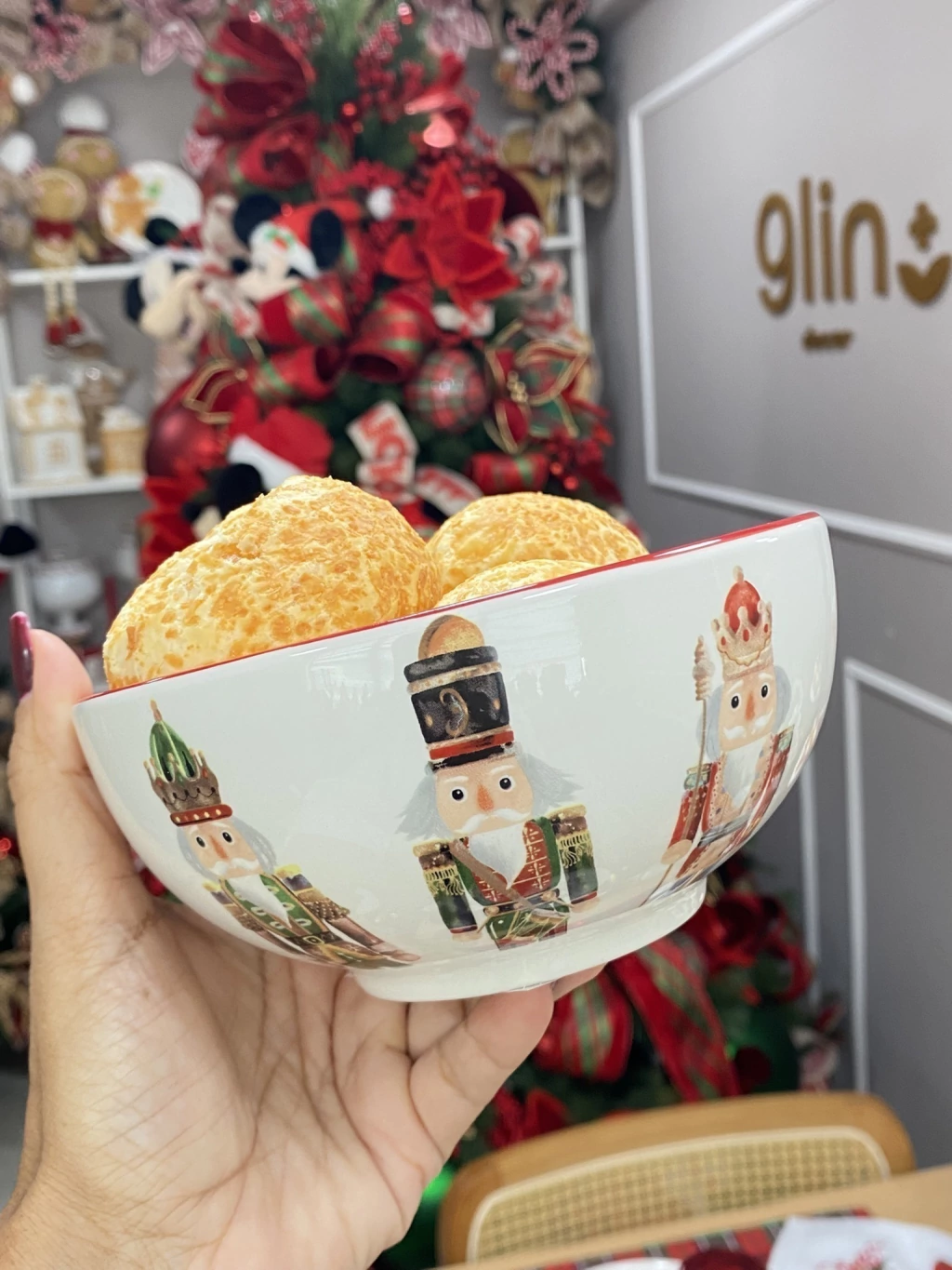 Com uma borda vermelha vibrante e ilustrações detalhadas de três soldados Quebra-Nozes, ele é perfeito para servir petiscos, sobremesas ou sopas. A delicada estampa e o acabamento de alta qualidade tornam esta peça um destaque em qualquer celebração natalina, adicionando um toque de charme e alegria.