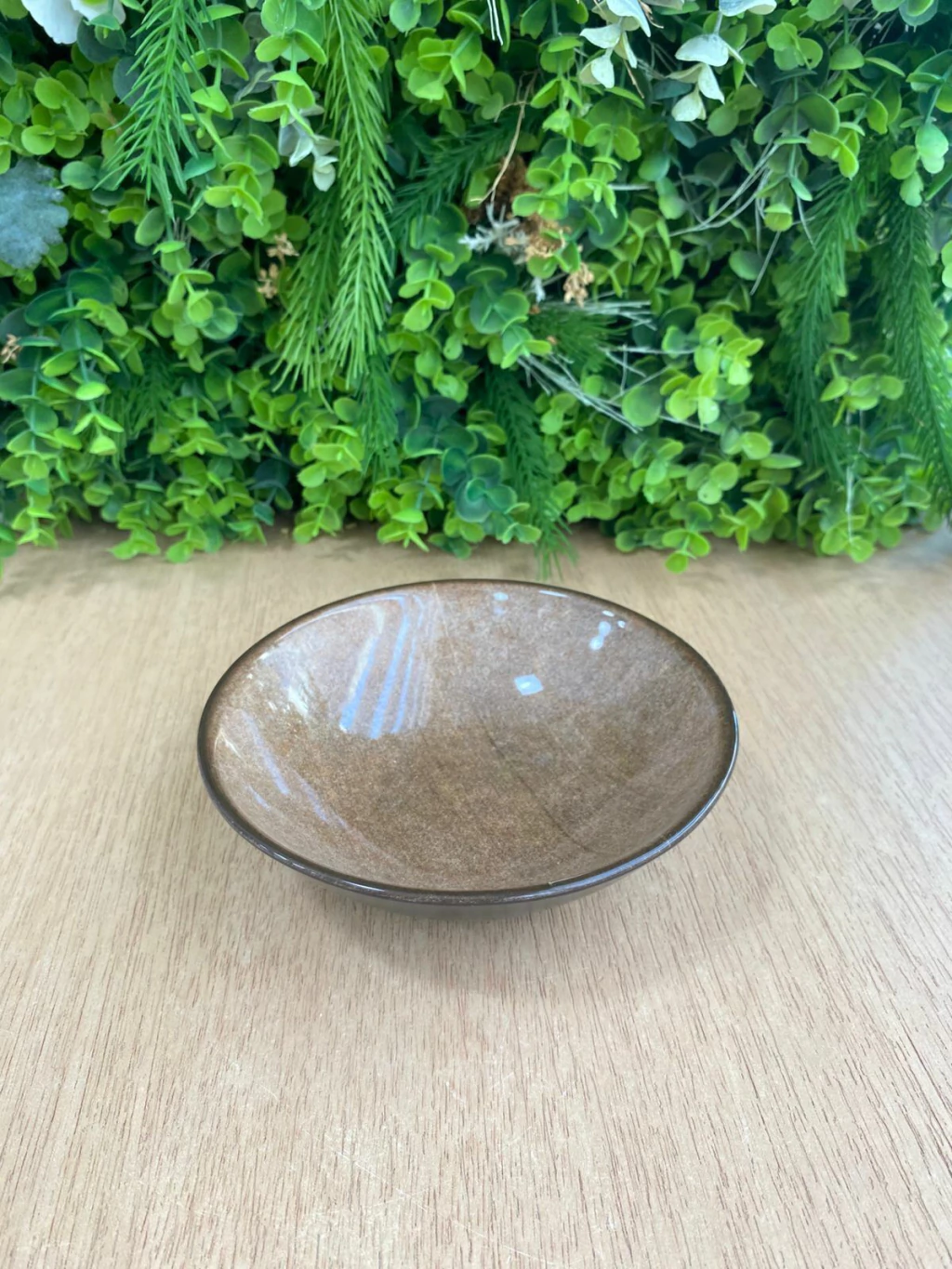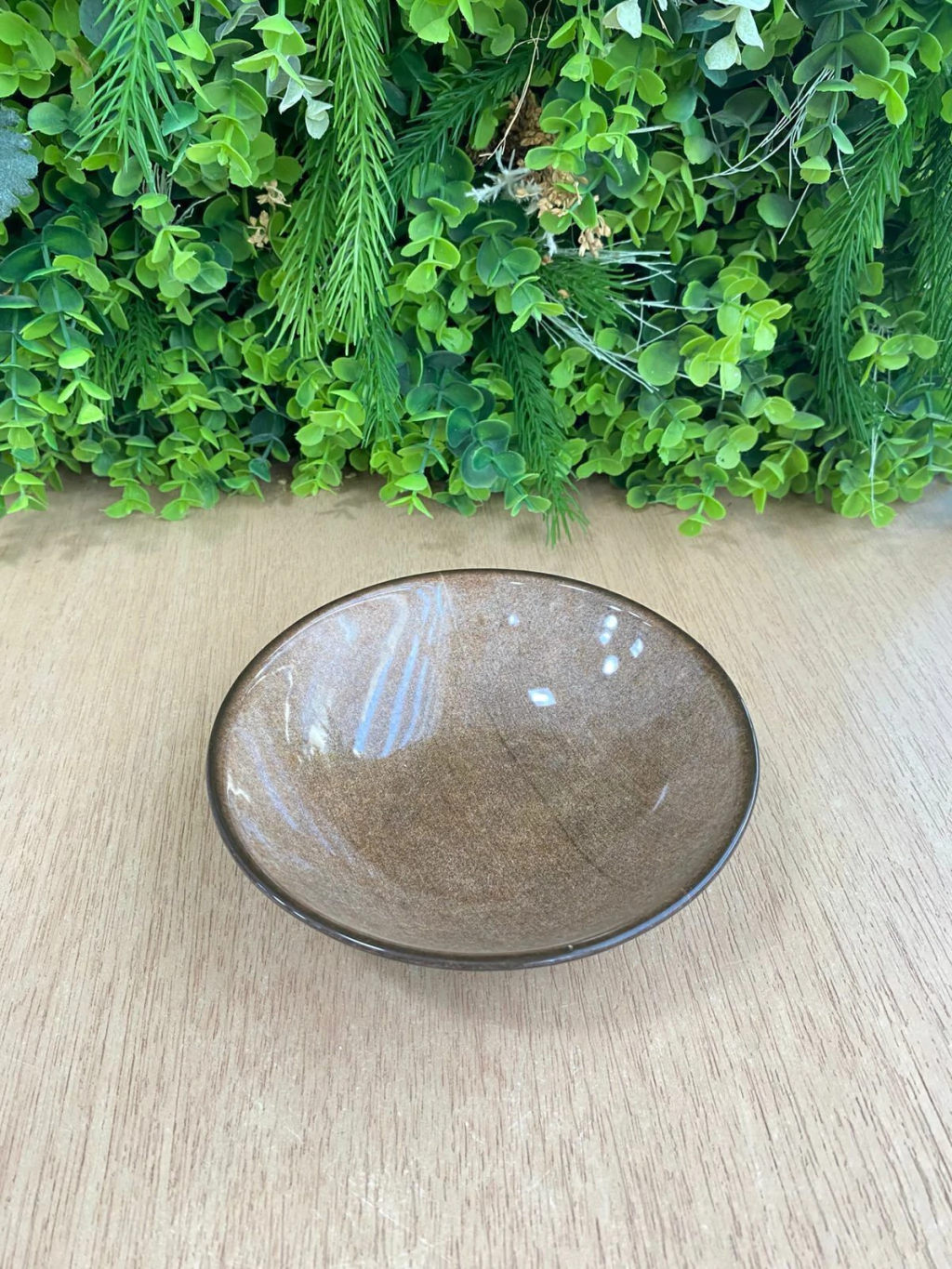Este é um bowl da linha Viena, com um design rústico e natural. A peça apresenta um acabamento que imita a textura da terra ou da areia, em tons de marrom e bege. A sua superfície interna é côncava e brilhante, enquanto a borda é ligeiramente mais escura, o que cria um contraste sutil, ideal para servir porções individuais de sopas, molhos, saladas ou sobremesas.