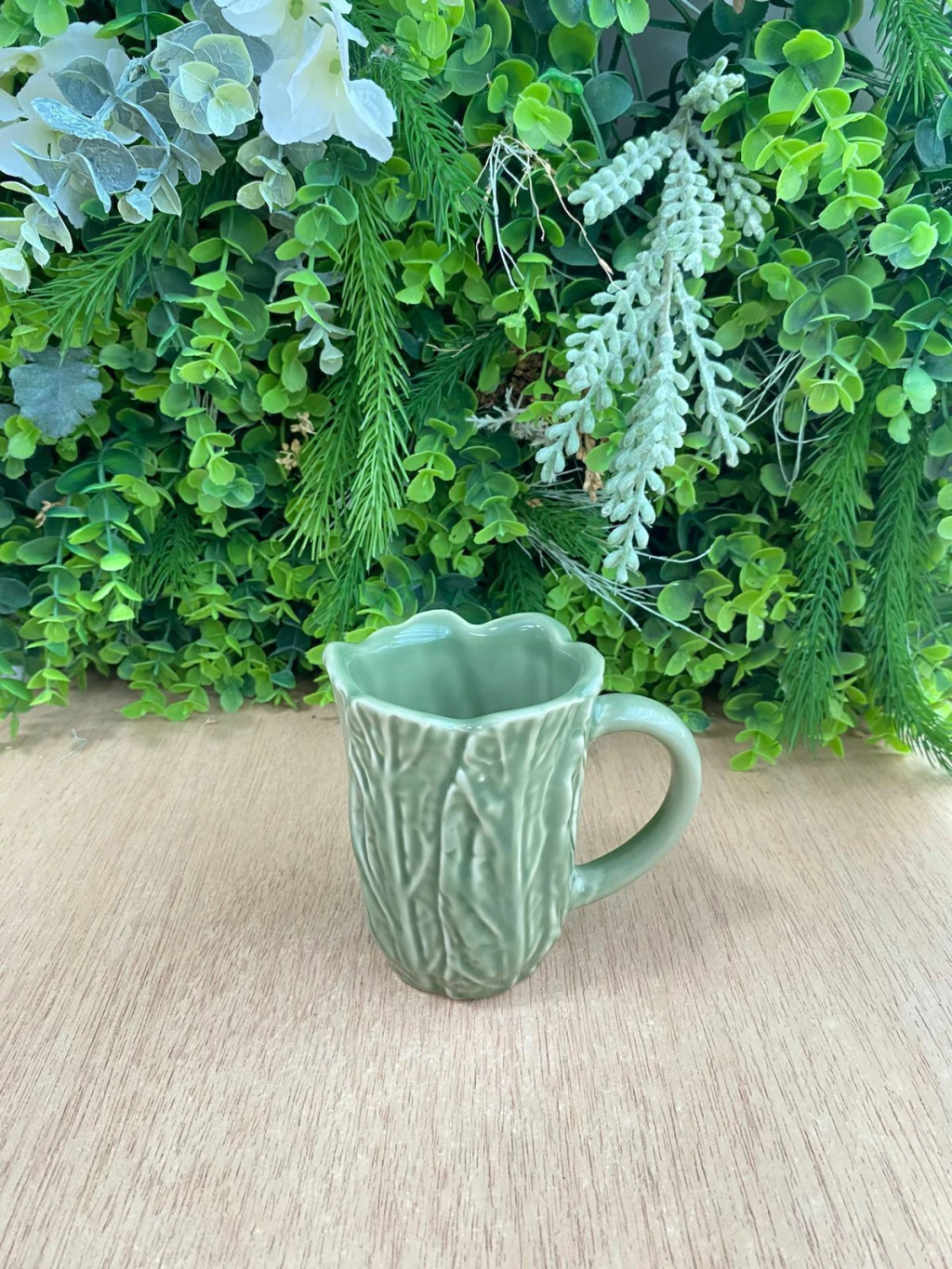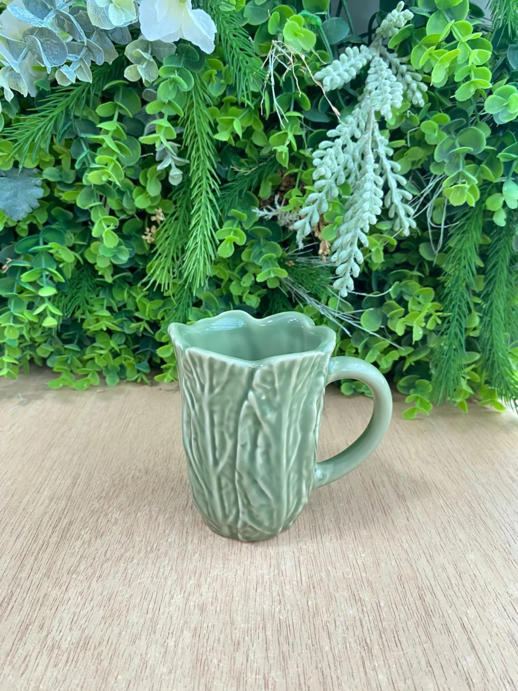 Esta caneca, com sua textura detalhada que imita as folhas de couve, é uma peça única e cheia de personalidade. O tom de verde vibrante e a alça esculpida em forma de talo trazem um toque de natureza e frescor para a sua mesa, transformando a experiência de beber seu chá ou café.