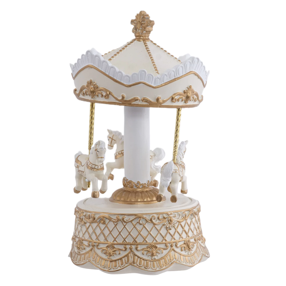 O carrossel, além de ser uma linda peça de decoração, especialmente adequada para quartos de bebê, festas temáticas ou para a decoração de Natal, funciona como uma caixa de música, onde os cavalinhos giram ao som de uma melodia.