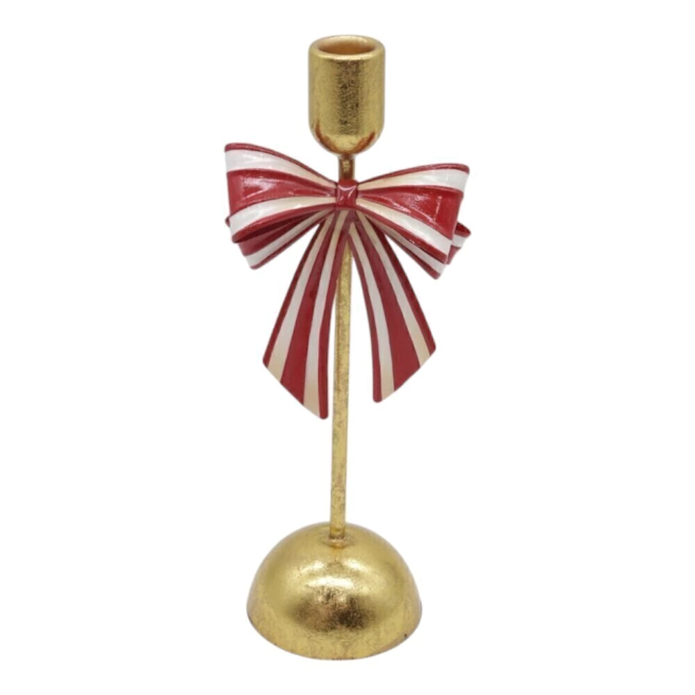 O ponto focal é o charmoso laço decorativo em vermelho e branco, com um padrão listrado que remete aos clássicos "candycane" (bengalas doces) de Natal. Este detalhe lúdico e festivo adiciona um toque de cor e alegria, tornando o castiçal uma peça central atraente em qualquer arranjo.