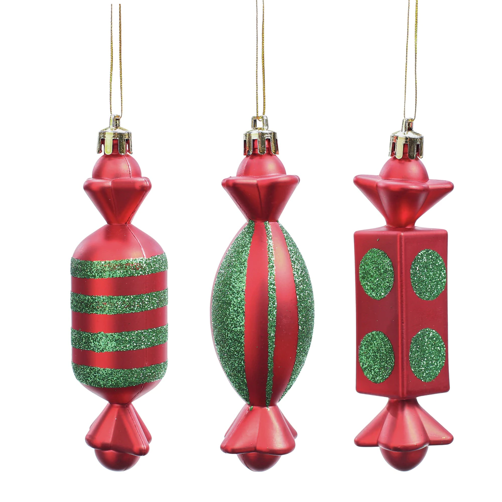 Este trio de ornamentos traz a alegria e as cores clássicas do Natal em um tema delicioso de confeitaria, perfeito para decorações temáticas Candy Land ou para dar um toque lúdico à sua árvore tradicional.