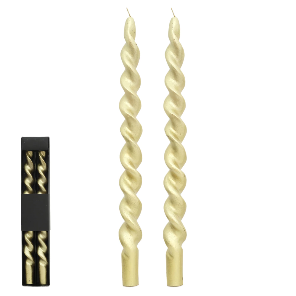Este é um sofisticado Conjunto de Velas Espiral Dourado, perfeito para criar um visual dinâmico, moderno e luxuoso em sua mesa ou arranjo decorativo, especialmente durante as festividades.