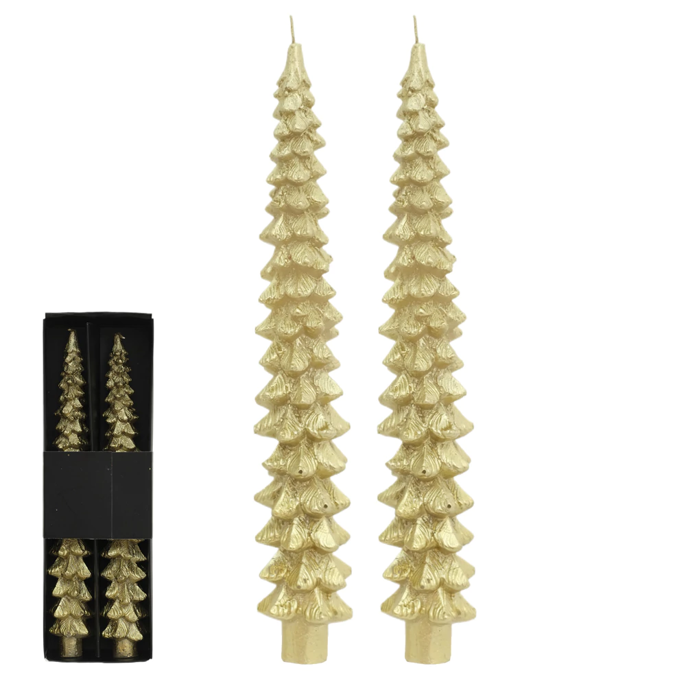 Formato: As velas são longas e cônicas, moldadas com precisão no formato de um pinheiro (árvore de Natal), com camadas de cera em relevo que simulam os galhos e a textura das folhas. A forma alongada confere um visual imponente, similar a uma vela palito alta.