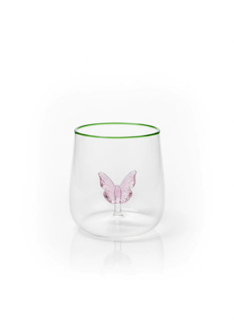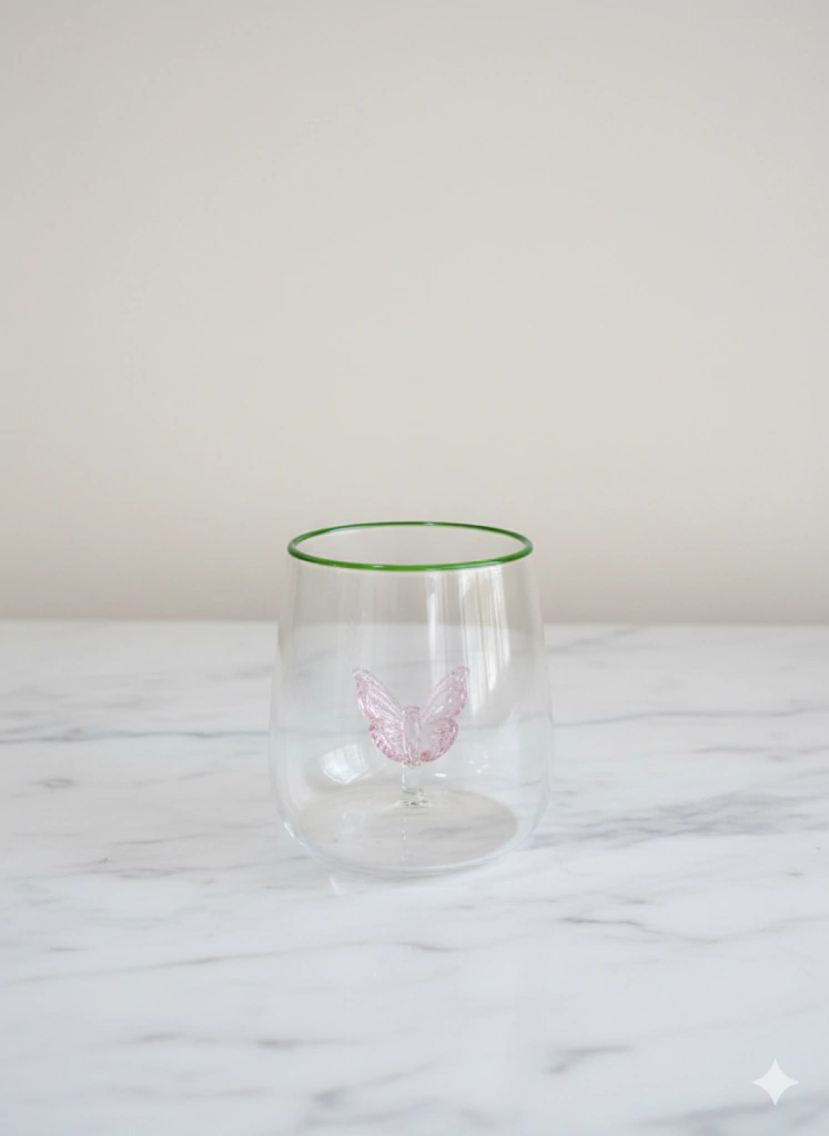 Feito em vidro de alta qualidade, ele se destaca pelo seu design único: um detalhe tridimensional de uma borboleta em vidro no fundo, que parece flutuar dentro do copo. Um filete verde na borda complementa o visual, dando um toque de cor e um acabamento elegante.