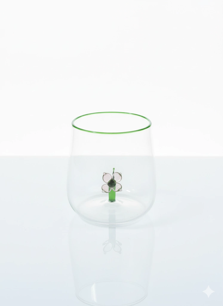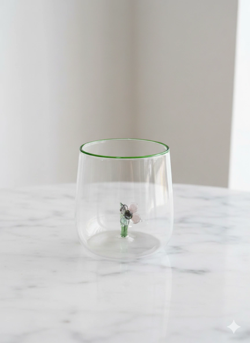 Feito em vidro de alta qualidade, ele se destaca pelo seu design único: um detalhe tridimensional de uma flor em vidro no fundo, que parece flutuar dentro do copo. Um filete verde na borda complementa o visual, dando um toque de cor e um acabamento elegante.