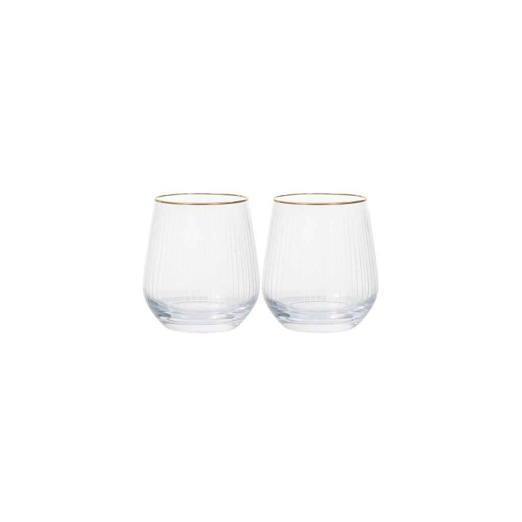 Cada copo possui um corpo arredondado, ideal para uma pegada confortável, e é adornado com linhas caneladas verticais que criam um belo jogo de luz e textura. A borda delicadamente dourada adiciona um acabamento exclusivo e um toque de glamour. O formato e o fundo sólido garantem estabilidade, enquanto a capacidade generosa permite servir uma variedade de bebidas, como whisky, sucos ou coquetéis.