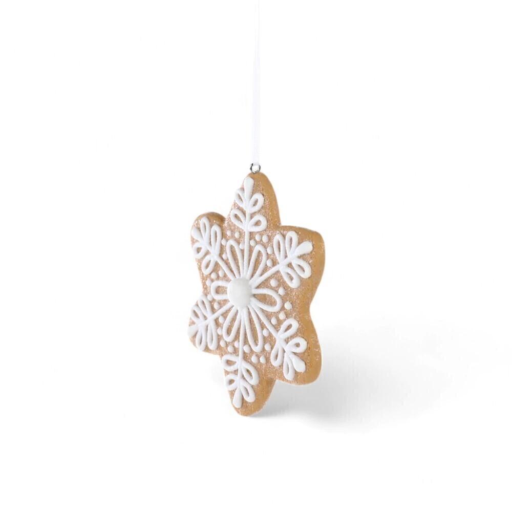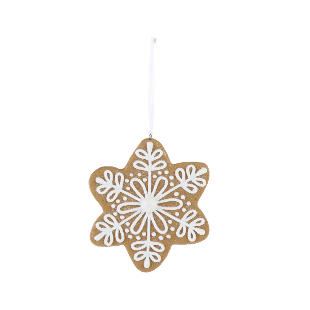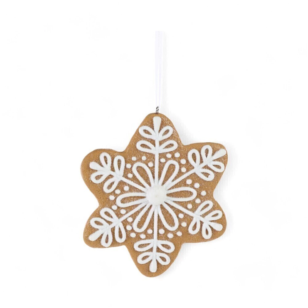 Com 11 cm de diâmetro, o enfeite tem a cor e a textura que lembram um biscoito de gengibre, e é decorado com um padrão em relevo que imita glacê branco. O design detalhado no centro e nas pontas dá um toque elegante e festivo. Ele vem com um cordão para ser pendurado, sendo ideal para adicionar um toque aconchegante e de inverno à sua decoração de Natal.