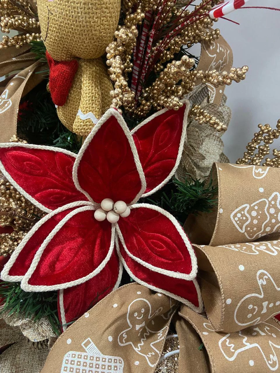 As pétalas em tecido vermelho aveludado são delicadamente delineadas com um cordão rústico na cor cru, criando um contraste visual interessante. O centro da flor é adornado com pequenas bagas brancas, que completam o visual festivo e sofisticado. A haste na parte de trás torna-o versátil, perfeito para ser usado na árvore de Natal, em guirlandas ou em arranjos de mesa.