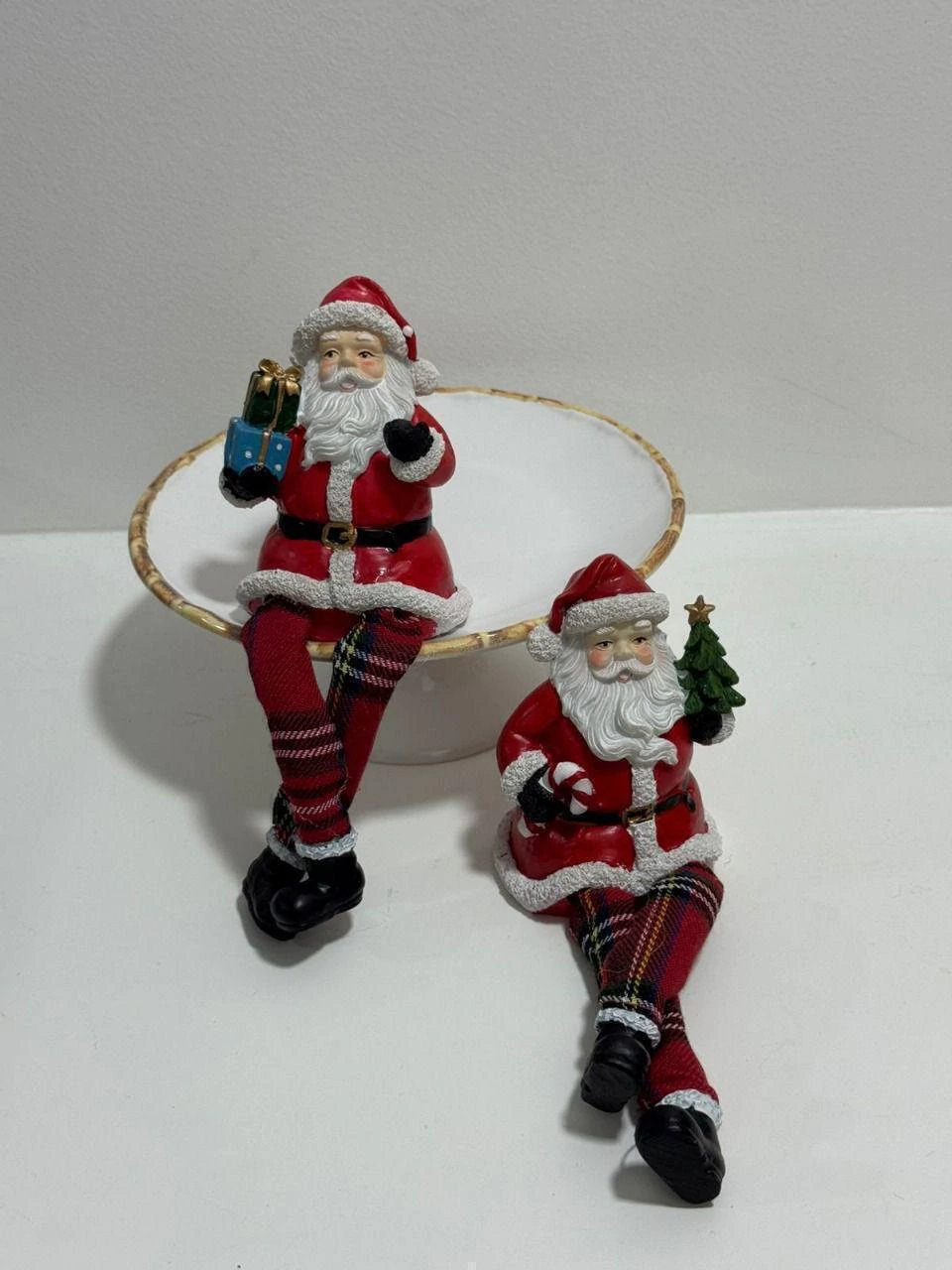 Design para Bordas (Pernas Flexíveis): O corpo superior é confeccionado em material rígido (resina ou plástico), enquanto as longas pernas são feitas de tecido (pano) em padronagem xadrez festiva. Essa construção permite que o Noel seja posicionado sentado na beira de prateleiras, lareiras, ou bordas de vasos, deixando as pernas soltas e balançando.
