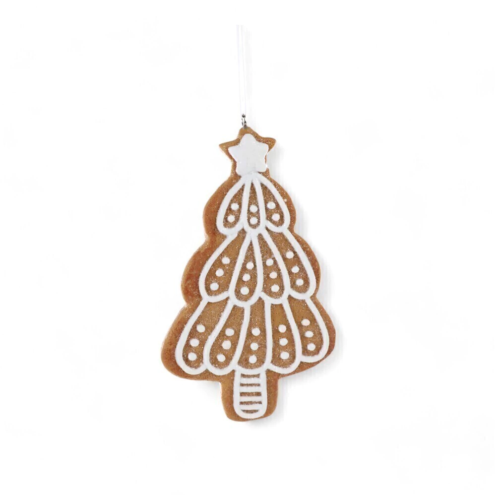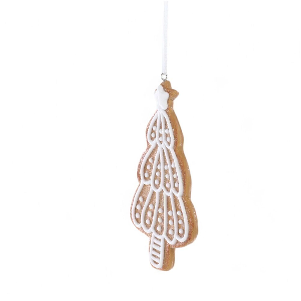 Com 11cm de altura, o enfeite tem a cor e a textura que lembram um biscoito de gengibre, com detalhes em relevo de glacê branco que formam um padrão festivo, e uma estrela no topo. Ele vem com um cordão para ser pendurado, adicionando um toque temático e aconchegante ao seu espaço.