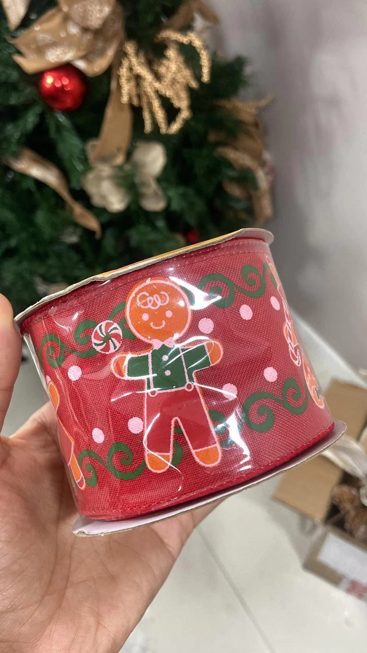 Aparência: O fundo vermelho intenso faz com que a estampa dos biscoitos de gengibre em bege e verde se destaque de forma nítida. O resultado é uma fita com um visual clássico, natalino e divertido.