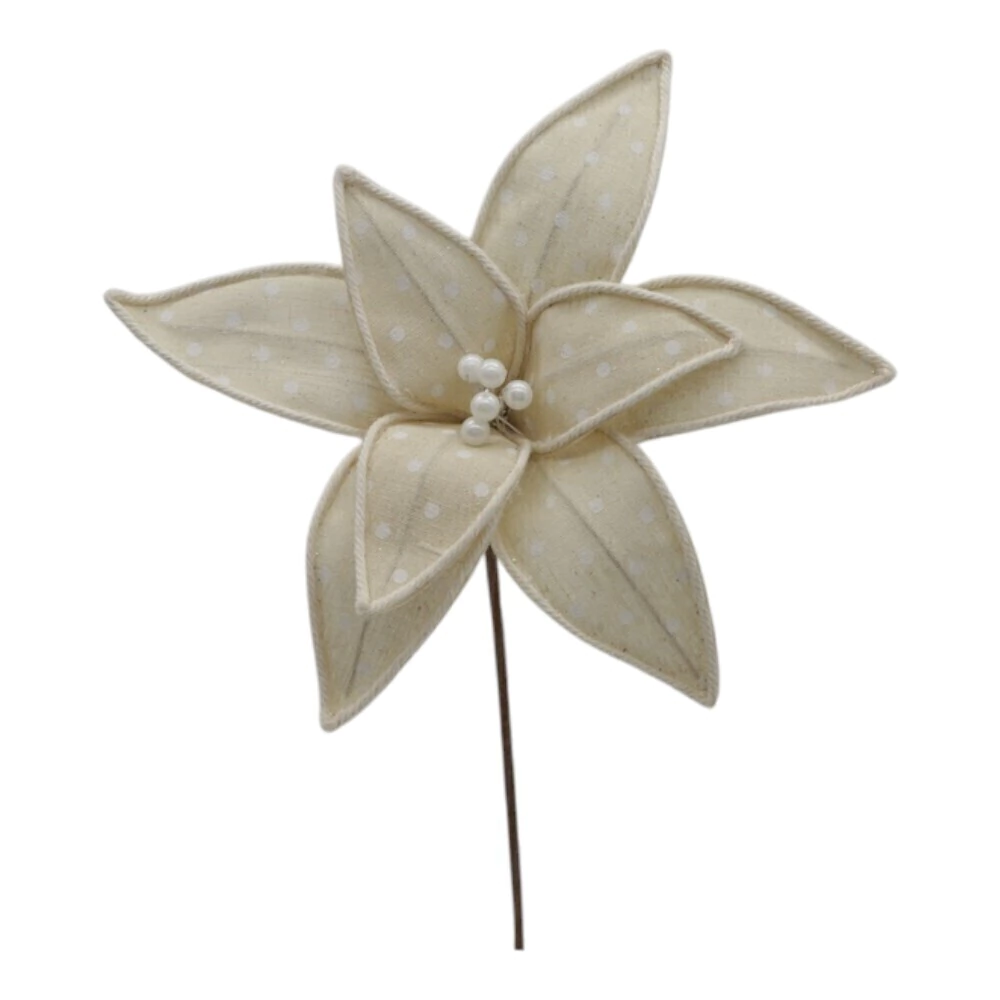 A Flor de Natal Bolinhas Suaves Creme é ideal para criar decorações que valorizam tons neutros, texturas naturais (como juta e linho) e o brilho do ouro ou prata fosco. É a peça perfeita para um Natal com estilo acolhedor e atemporal.