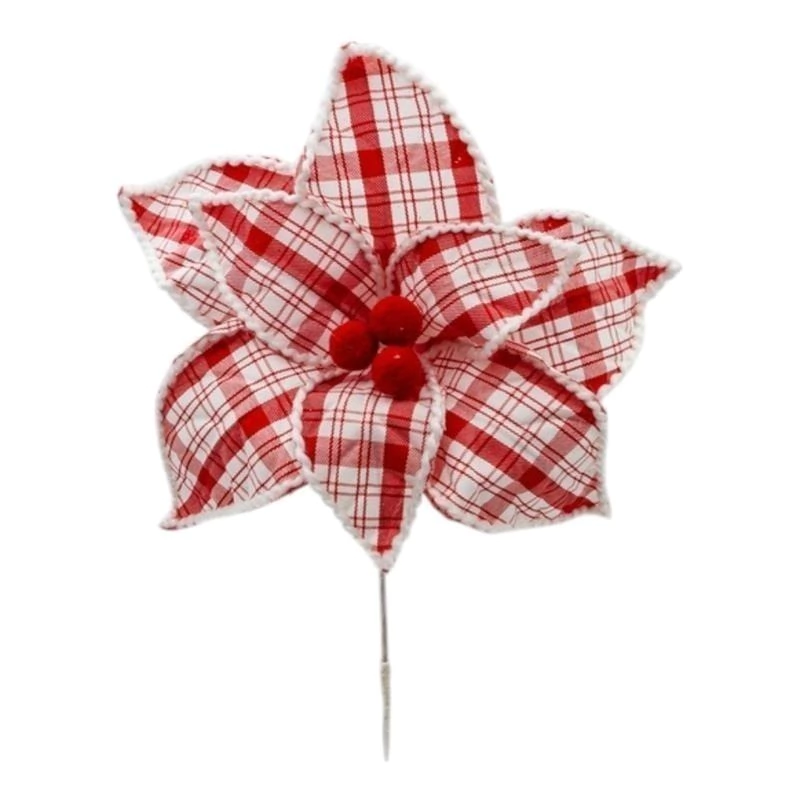Esta poinsétia decorativa é um enfeite encantador que combina o tradicional símbolo floral do Natal com um padrão têxtil popular e acolhedor, ideal para decorações no estilo country ou cottagecore.