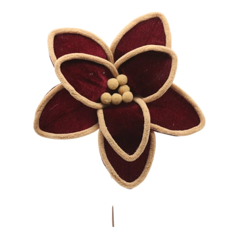 Adicione um toque de luxo e calidez à sua decoração festiva com a Flor de Veludo Bordô. Este enfeite imita uma Poinsettia (Flor-de-Natal) de forma estilizada e elegante, ideal para criar arranjos sofisticados em árvores, guirlandas ou centros de mesa.