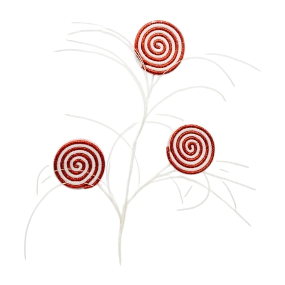 A base do galho é coberta por um acabamento branco e aveludado, imitando neve ou açúcar, do qual partem hastes finas e flexíveis. No topo de três dessas hastes, há três "pirulitos" em formato de espiral. Cada pirulito é decorado com um padrão circular de listras vermelhas e brancas, coberto por um glitter vibrante que reflete a luz, destacando-se em qualquer arranjo.
