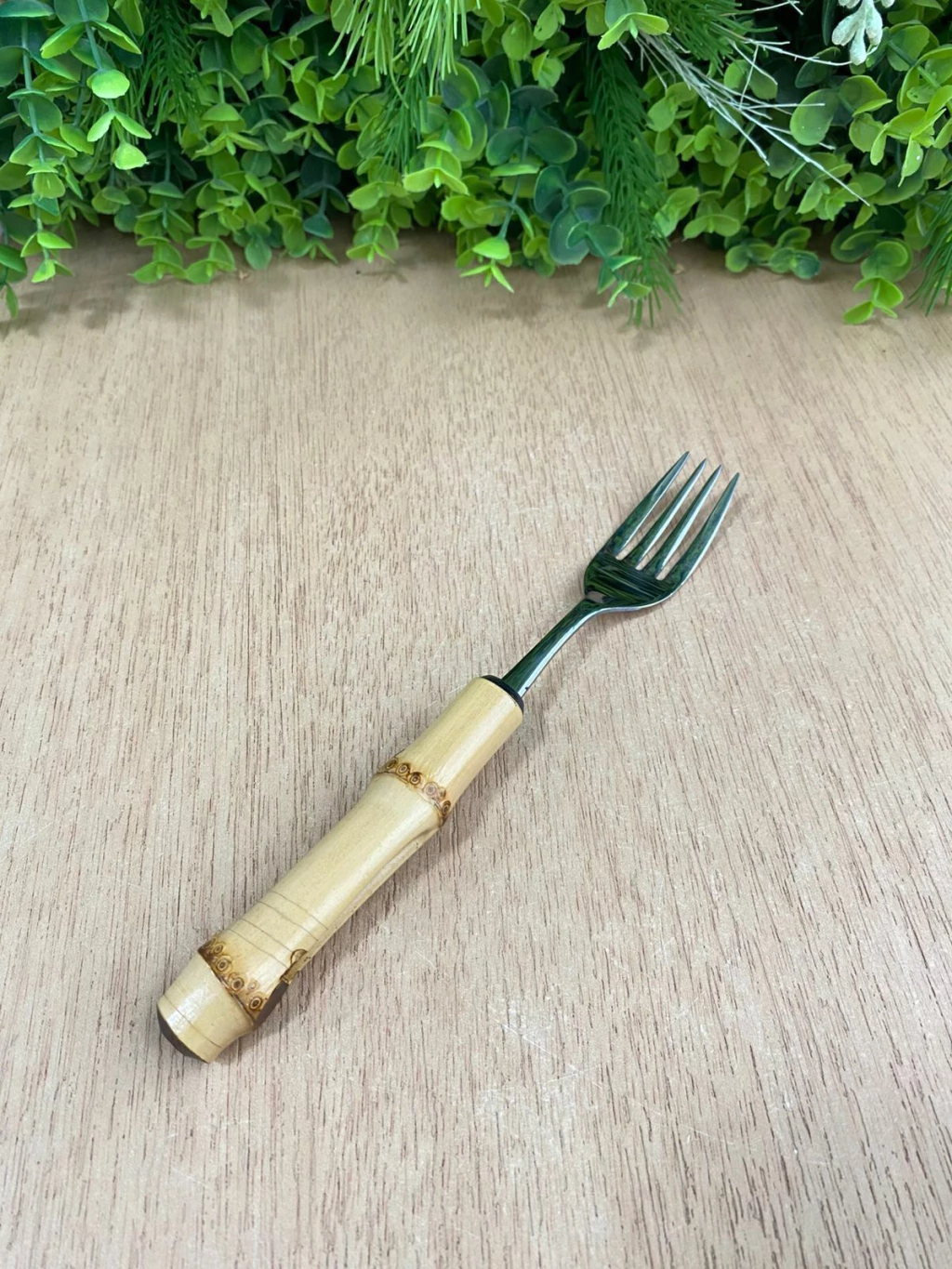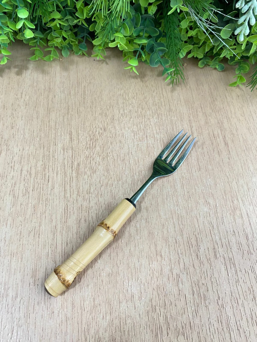 Este garfo de mesa elegante combina a durabilidade do aço inoxidável com a beleza natural de um cabo de bambu sintético. O design do cabo imita a textura e os anéis característicos do bambu, oferecendo uma pegada confortável e um toque rústico e sofisticado. A parte do garfo em metal tem um acabamento polido e brilhante, ideal para servir e para o uso diário, enquanto o contraste com o cabo de bambu cria uma peça única que se destaca em qualquer louça.