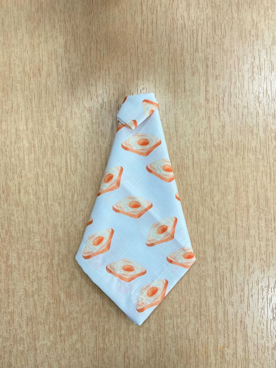 O design apresenta uma padronagem de fatias de pão com ovo, dispostas de forma irregular. A ilustração detalhada, com tons de laranja e amarelo vibrantes da gema e o tom neutro do pão, evoca uma sensação de aconchego e apetite, ideal para refeições matinais ou um brunch especial. A combinação de cores e o tema de café da manhã tornam este guardanapo um item único e cheio de personalidade.
