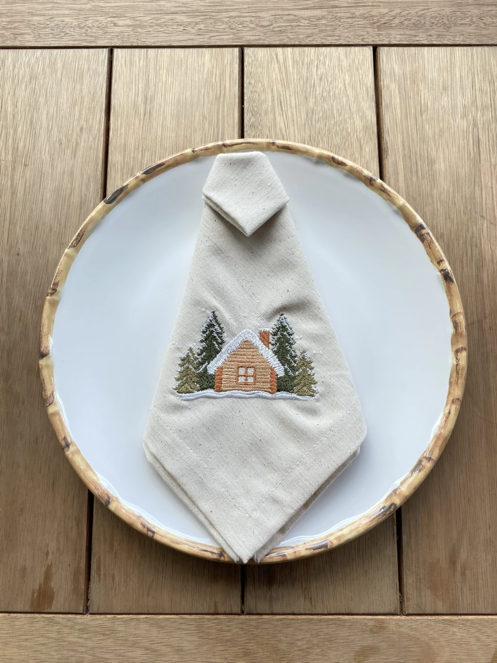 O item é feito de linho, com uma textura levemente mais rústica e natural, o que complementa o tema de montanha. Ele está dobrado de forma elegante, simulando uma gravata ou um cone.