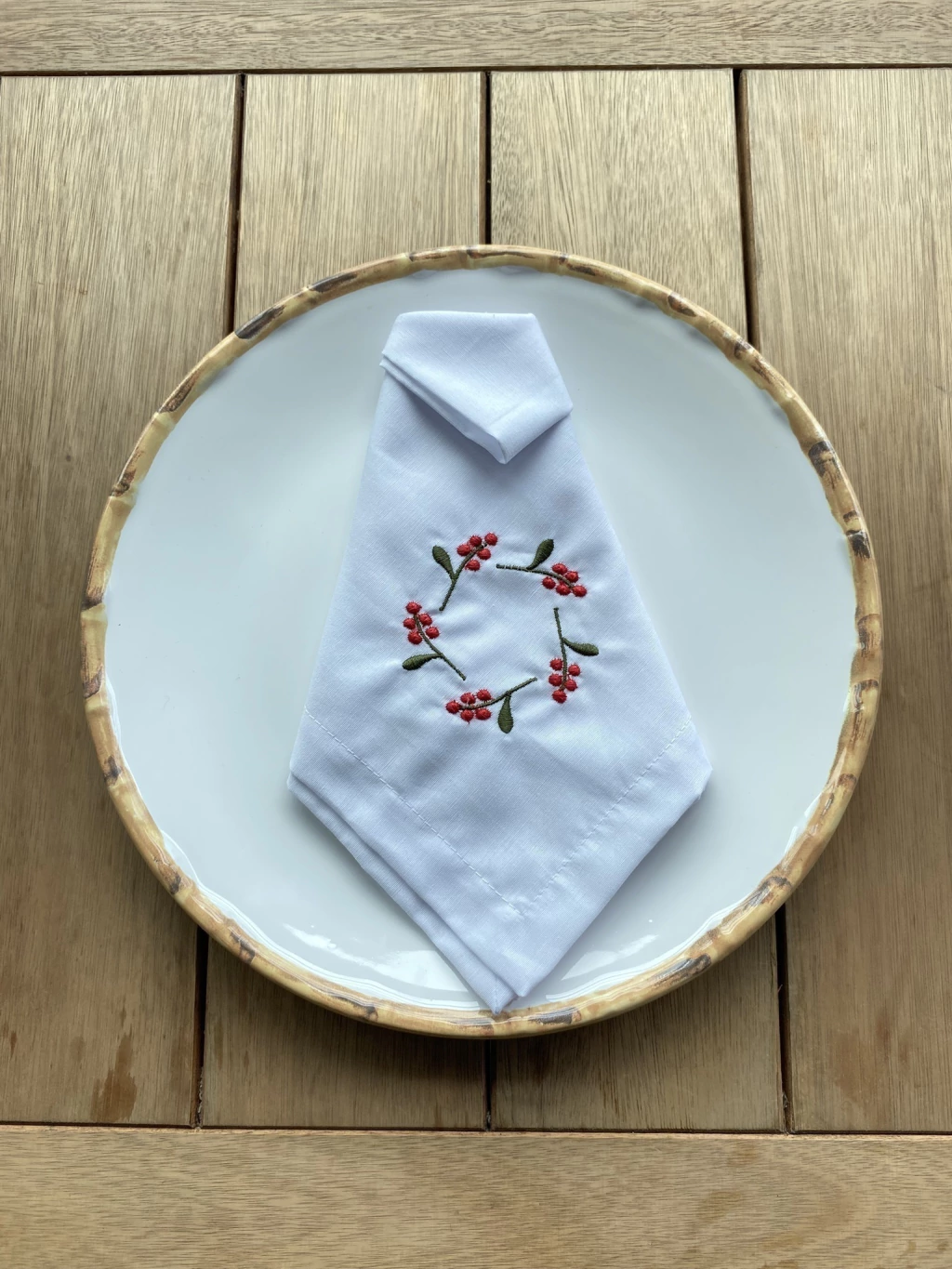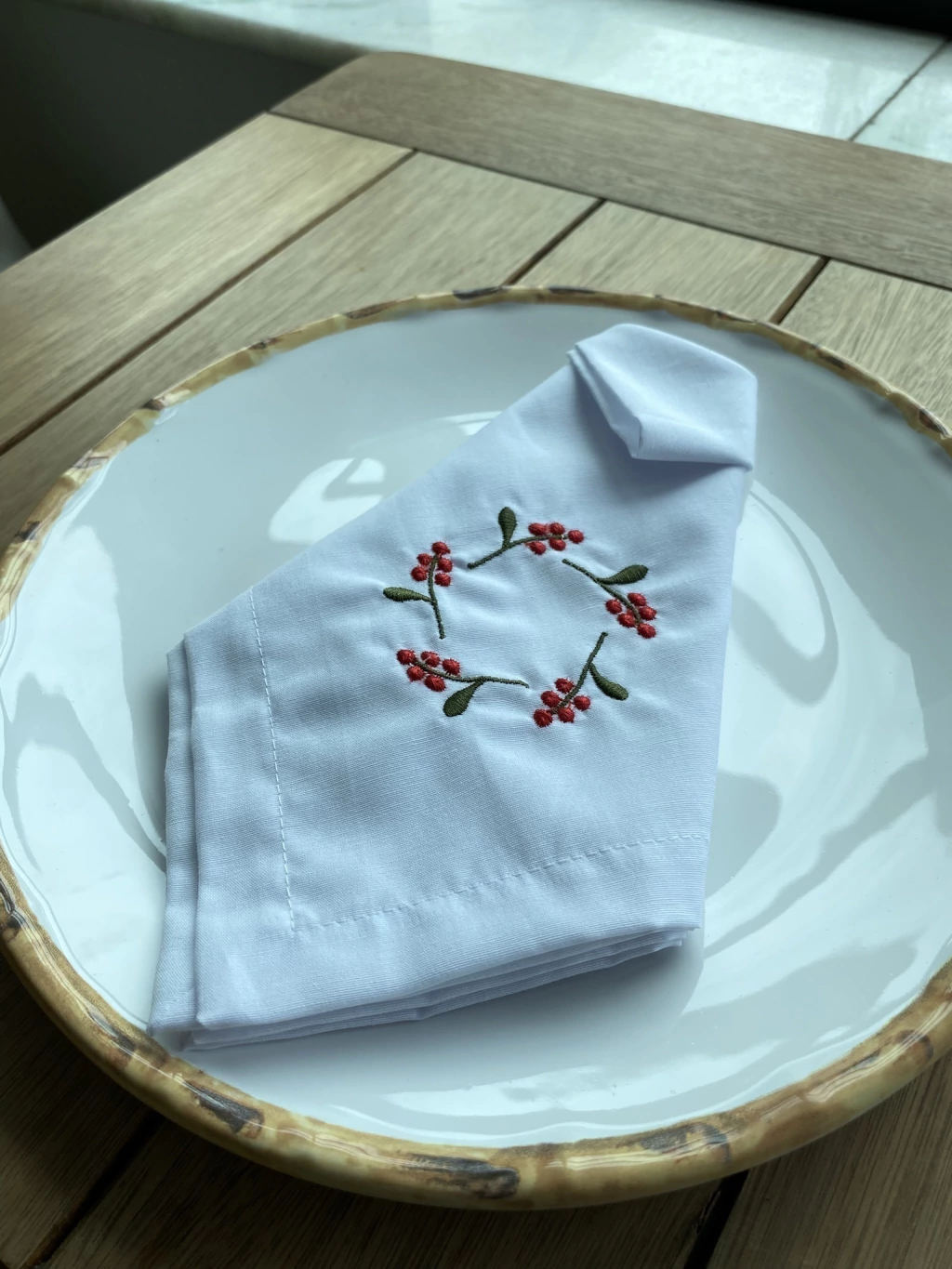 Este guardanapo é um toque de elegância sutil e charme natalino para o seu mise en place, ideal para quem prefere uma decoração festiva clássica e minimalista.