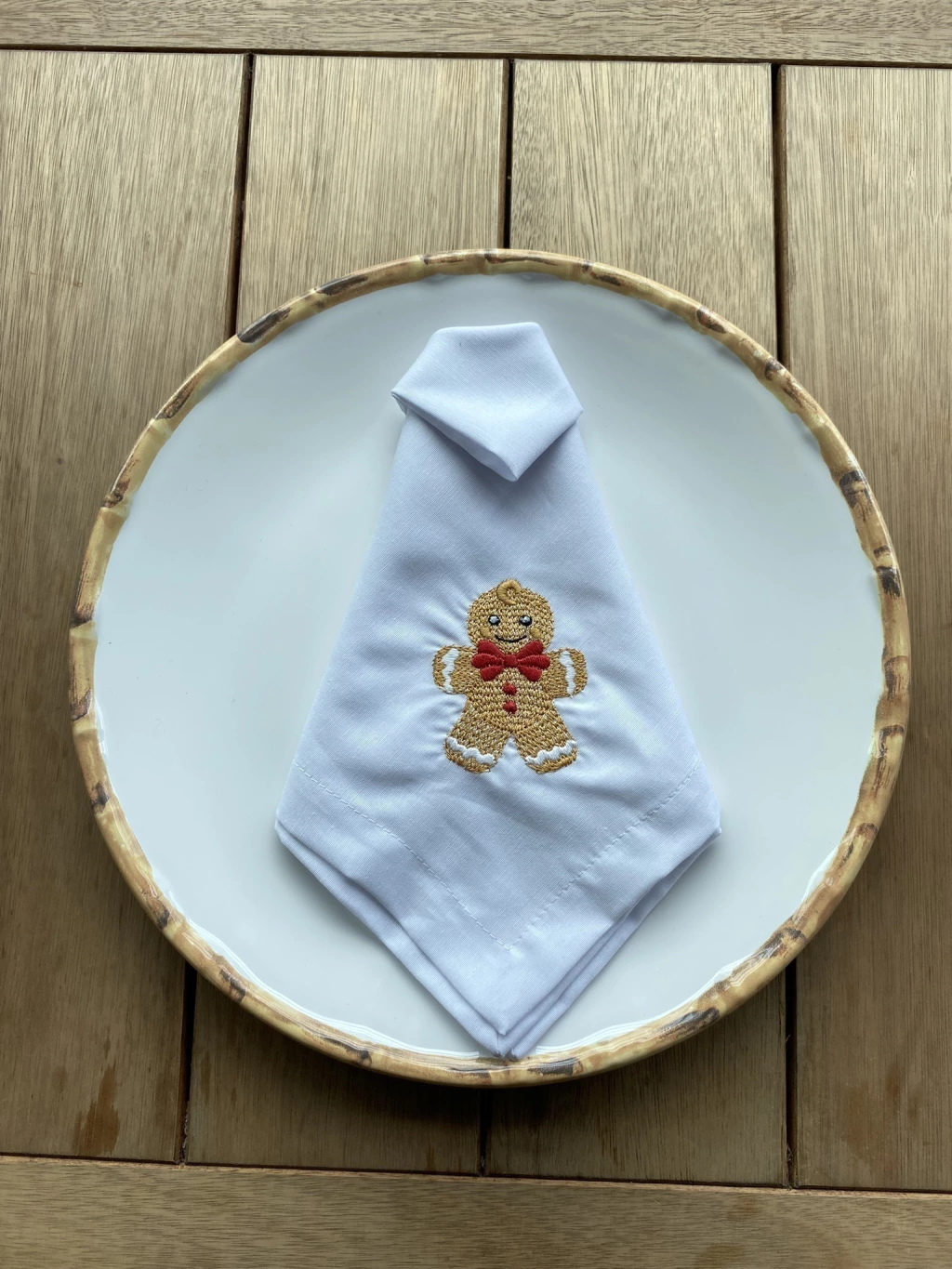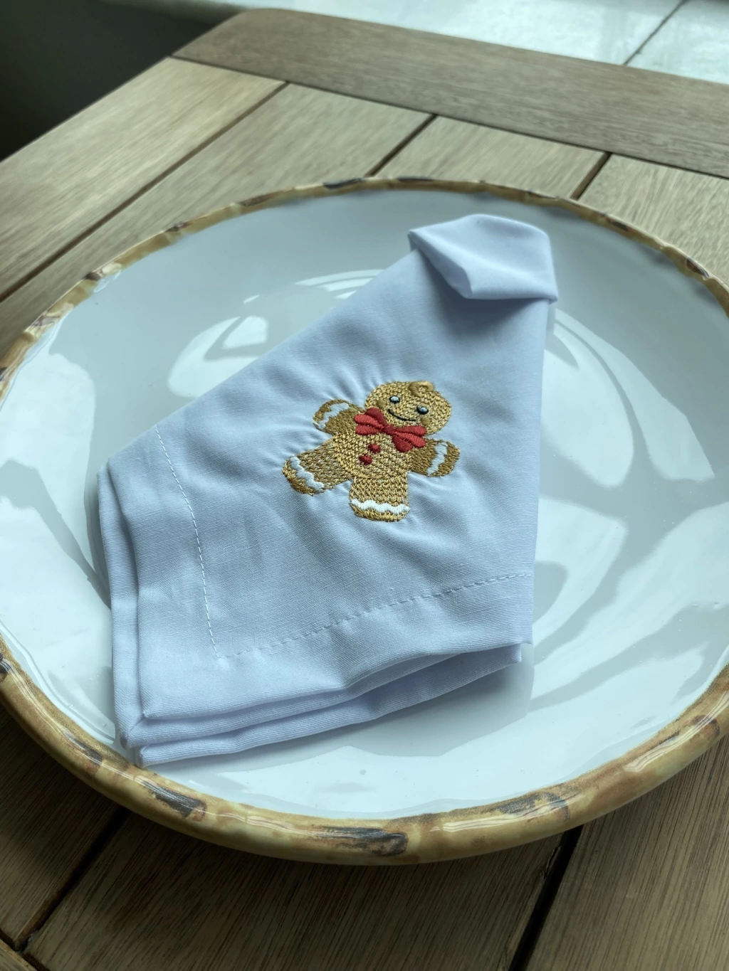 O destaque do guardanapo é o seu bordado artesanal de um único Homem-Biscoito (Gingerbread Man) em uma pose alegre: