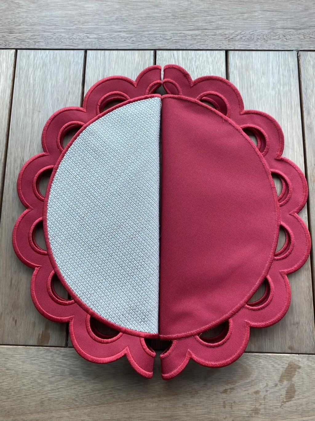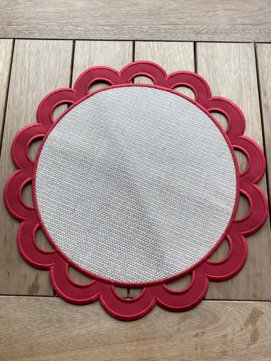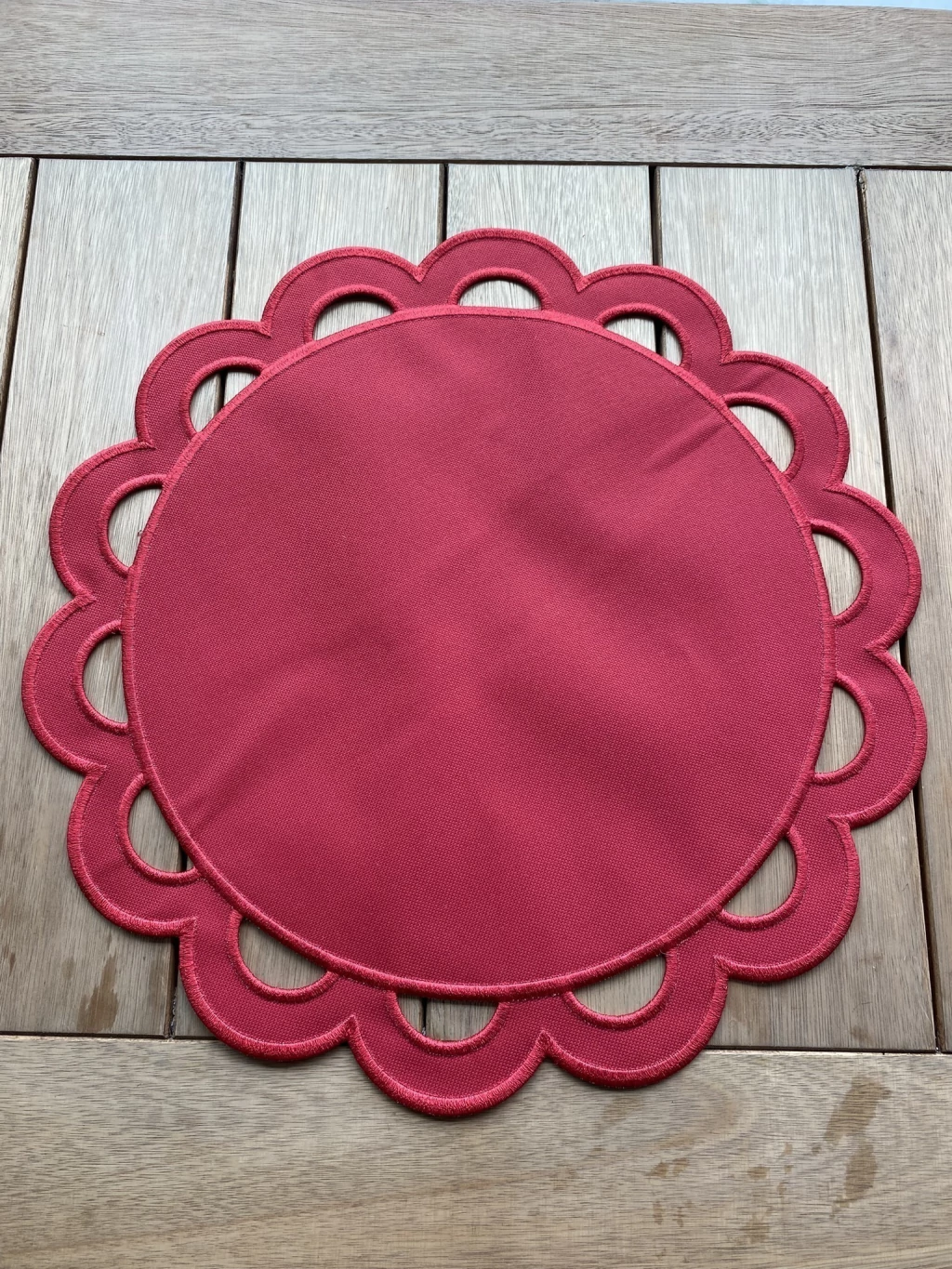 coroa de pétalas de flores ou a raios solares. Todo o contorno é finalizado com um viés ou costura em vermelho vibrante, garantindo estrutura e um acabamento impecável. Este design confere um toque de sofisticação e leveza à mesa.