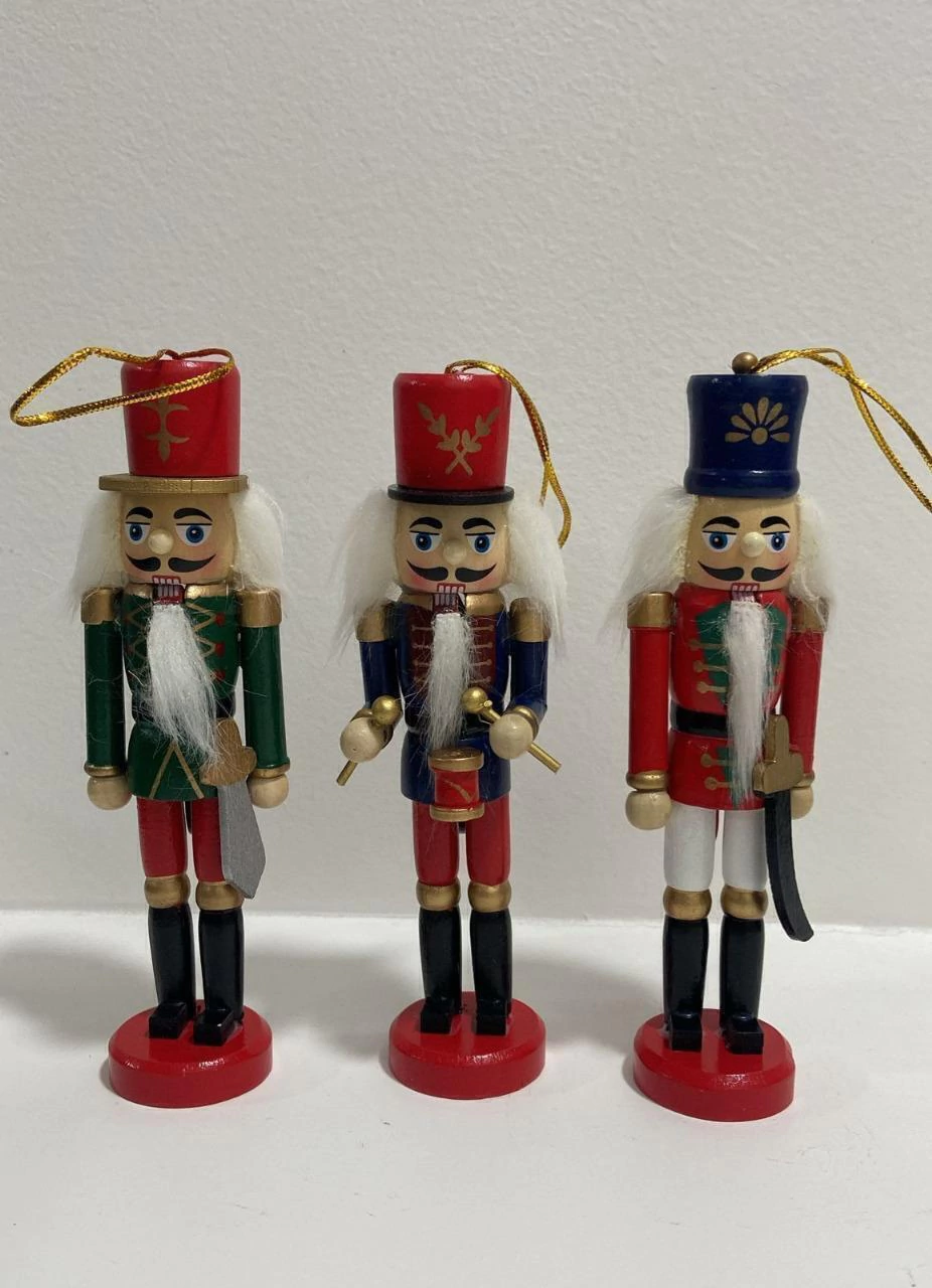 Este é um charmoso kit de três bonecos Quebra-Nozes (Nutcracker), perfeitos para adicionar um toque de tradição e elegância à sua decoração natalina. Os bonecos são feitos em madeira e pintados à mão com cores vibrantes.