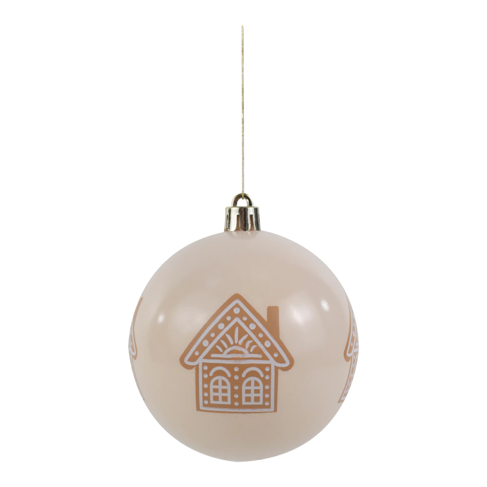 Acabamento Suave: As bolas possuem um belo acabamento em tom claro (marfim ou champanhe), com um brilho sutilmente perolado ou fosco. Este fundo neutro destaca a estampa marrom da casinha de gengibre.