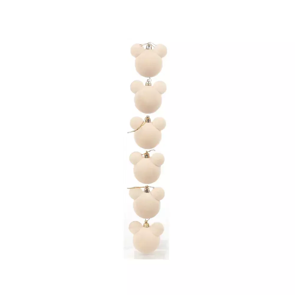 Este kit é composto por seis (6) enfeites de Natal no formato da cabeça icônica do Mickey Mouse, sendo ideal para adicionar um toque divertido e elegante à sua decoração natalina.