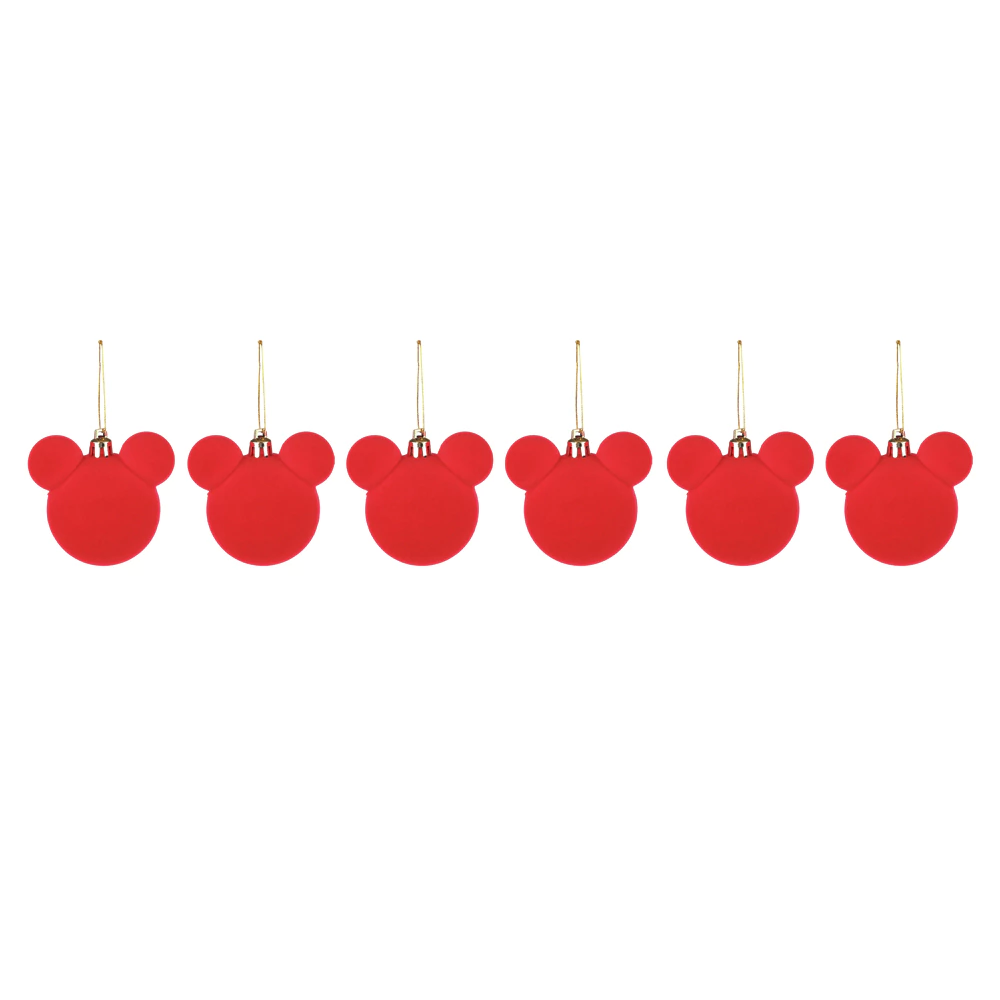 Formato: Os ornamentos são modelados na silhueta clássica da cabeça do Mickey Mouse (uma esfera maior com duas "orelhas" menores), adicionando um toque temático, divertido e imediatamente reconhecível à decoração.